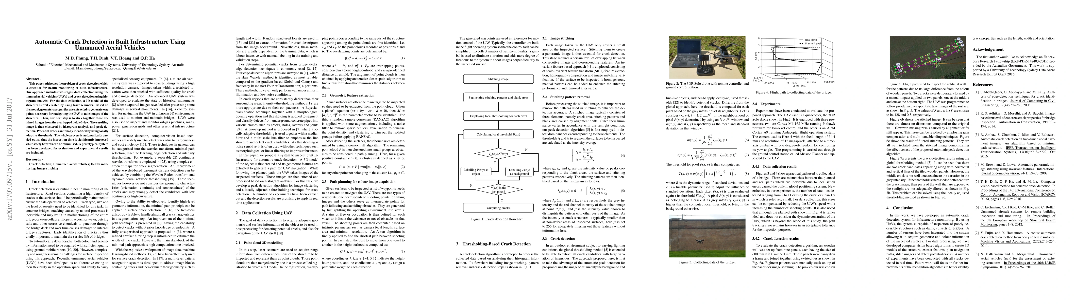 This paper addresses the problem of crack detection which is essential for health monitoring of built infrastructure. Our approach includes two stages, data collection using unmanned aerial vehicles (UAVs) and crack detection using histogram analysis. For the data collection, a 3D model of the structure is first created by using laser scanners. Based on the model, geometric properties are extracted to generate way points necessary for navigating the UAV to take images of the structure. Then, our next step is to stick together those obtained images from the overlapped field of view. The resulting image is then clustered by histogram analysis and peak detection. Potential cracks are finally identified by using locally adaptive thresholds. The whole process is automatically carried out so that the inspection time is significantly improved while safety hazards can be minimised. A prototypical system has been developed for evaluation and experimental results are included.