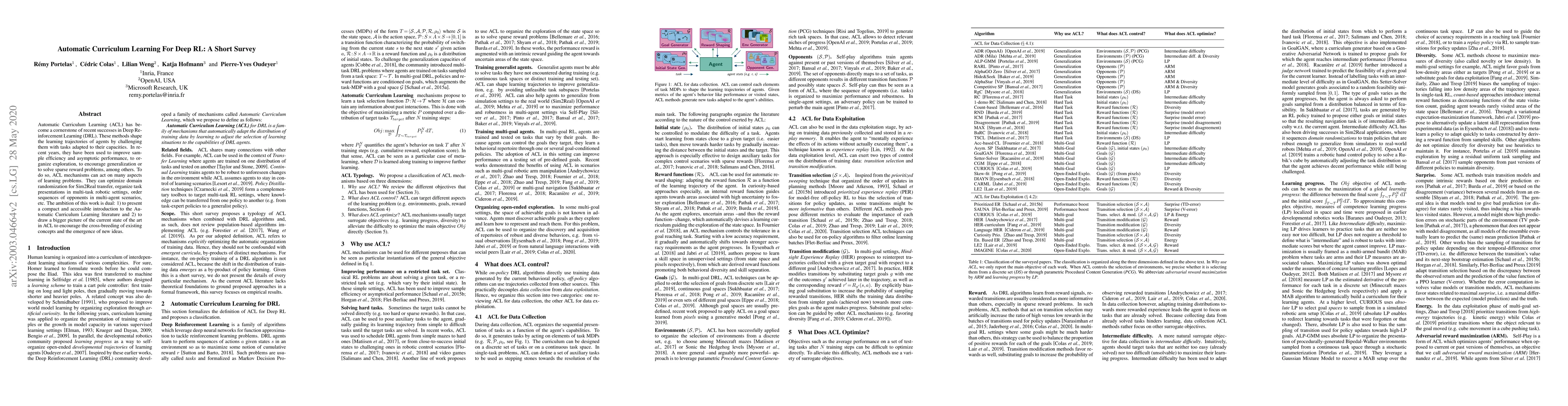 Automatic Curriculum Learning (ACL) has become a cornerstone of recent successes in Deep Reinforcement Learning (DRL).These methods shape the learning trajectories of agents by challenging them with tasks adapted to their capacities. In recent years, they have been used to improve sample efficiency and asymptotic performance, to organize exploration, to encourage generalization or to solve sparse reward problems, among others. The ambition of this work is dual: 1) to present a compact and accessible introduction to the Automatic Curriculum Learning literature and 2) to draw a bigger picture of the current state of the art in ACL to encourage the cross-breeding of existing concepts and the emergence of new ideas.