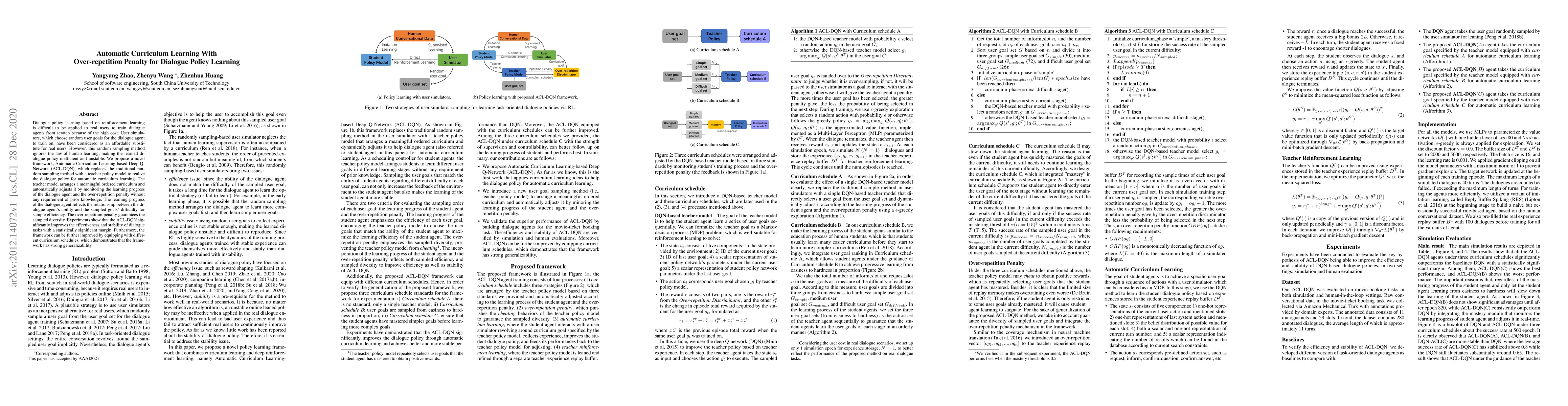 This paper introduces ACL-DQN, a framework for automatic curriculum learning in dialogue policy reinforcement learning, which uses a teacher policy model to create an ordered curriculum and applies an over-repetition penalty for diversity, significantly improving dialogue policy effectiveness and stability compared to random sampling methods.