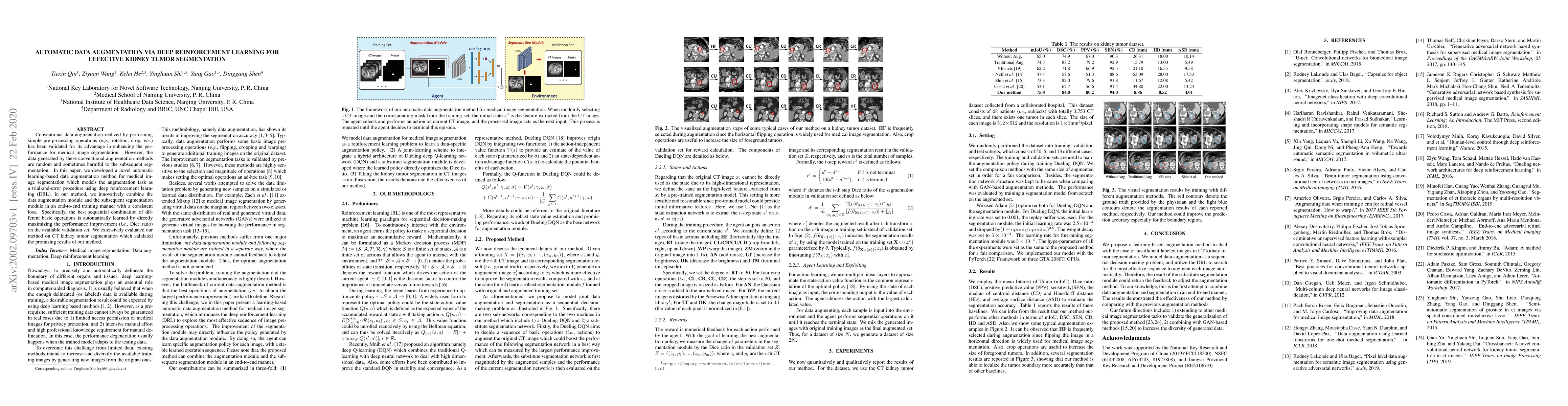 This paper proposes a novel automatic data augmentation method using deep reinforcement learning for kidney tumor segmentation. The method combines data augmentation and segmentation in an end-to-end training framework to optimize augmentation strategies, improving segmentation performance as measured by the Dice ratio.