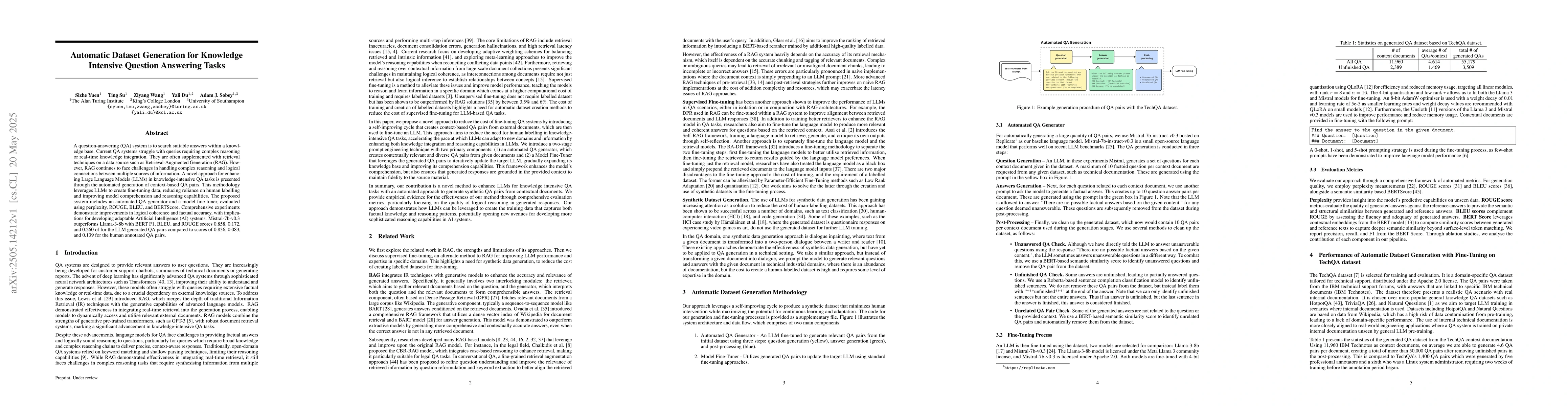 A question-answering (QA) system is to search suitable answers within a knowledge base. Current QA systems struggle with queries requiring complex reasoning or real-time knowledge integration. They are often supplemented with retrieval techniques on a data source such as Retrieval-Augmented Generation (RAG). However, RAG continues to face challenges in handling complex reasoning and logical connections between multiple sources of information. A novel approach for enhancing Large Language Models (LLMs) in knowledge-intensive QA tasks is presented through the automated generation of context-based QA pairs. This methodology leverages LLMs to create fine-tuning data, reducing reliance on human labelling and improving model comprehension and reasoning capabilities. The proposed system includes an automated QA generator and a model fine-tuner, evaluated using perplexity, ROUGE, BLEU, and BERTScore. Comprehensive experiments demonstrate improvements in logical coherence and factual accuracy, with implications for developing adaptable Artificial Intelligence (AI) systems. Mistral-7b-v0.3 outperforms Llama-3-8b with BERT F1, BLEU, and ROUGE scores 0.858, 0.172, and 0.260 of for the LLM generated QA pairs compared to scores of 0.836, 0.083, and 0.139 for the human annotated QA pairs.