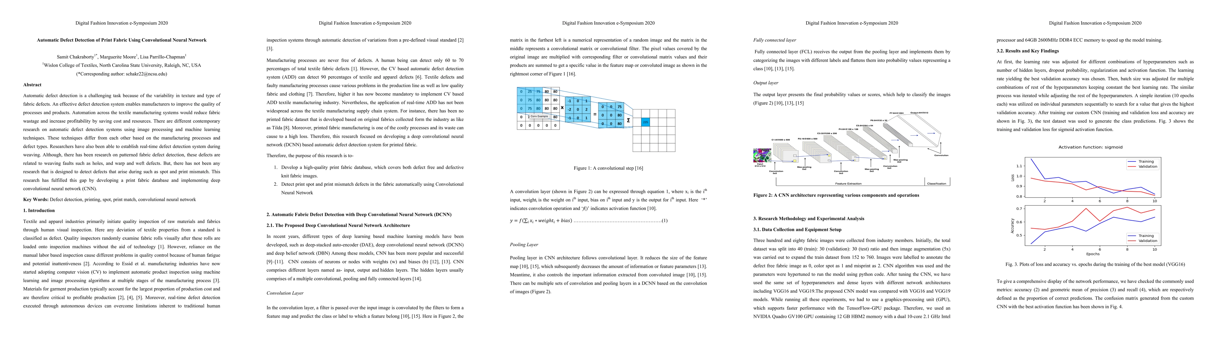 This paper presents a convolutional neural network (CNN) for automatic defect detection in print fabrics, focusing on spotting and print mismatch issues. The study aims to improve fabric quality and reduce wastage in textile manufacturing through advanced image processing techniques.