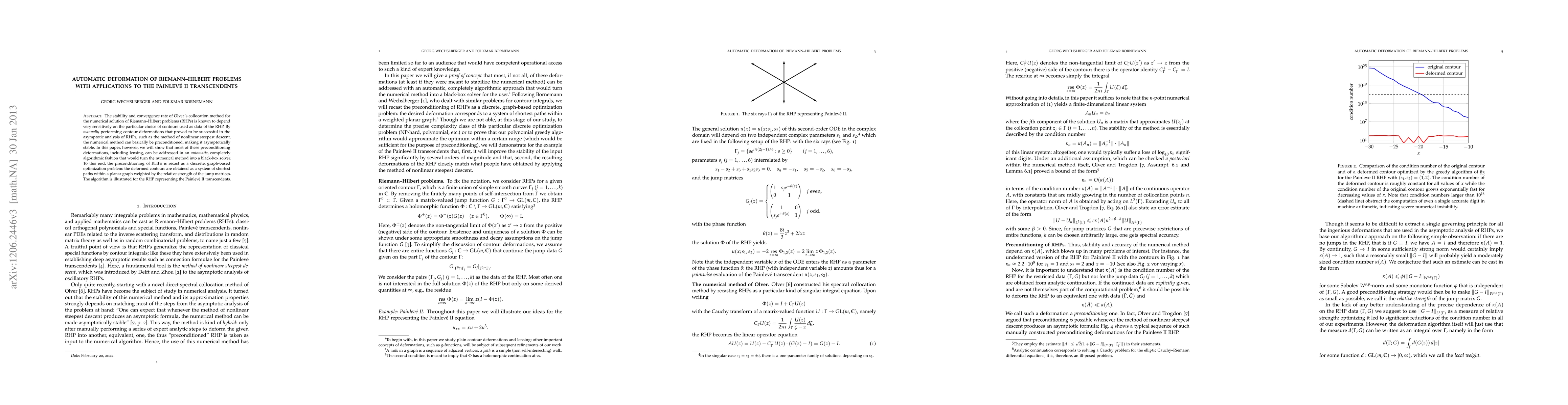 The stability and convergence rate of Olver's collocation method for the numerical solution of Riemann-Hilbert problems (RHPs) is known to depend very sensitively on the particular choice of contours used as data of the RHP. By manually performing contour deformations that proved to be successful in the asymptotic analysis of RHPs, such as the method of nonlinear steepest descent, the numerical method can basically be preconditioned, making it asymptotically stable. In this paper, however, we will show that most of these preconditioning deformations, including lensing, can be addressed in an automatic, completely algorithmic fashion that would turn the numerical method into a black-box solver. To this end, the preconditioning of RHPs is recast as a discrete, graph-based optimization problem: the deformed contours are obtained as a system of shortest paths within a planar graph weighted by the relative strength of the jump matrices. The algorithm is illustrated for the RHP representing the Painlev\'e II transcendents.