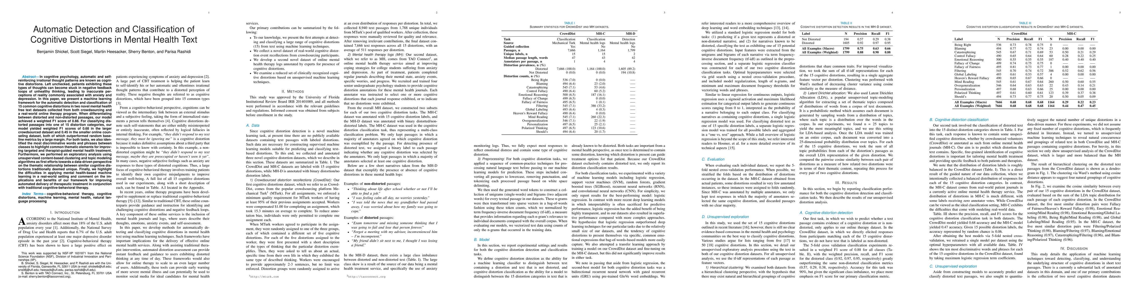 This paper presents a machine learning framework for detecting and classifying 15 common cognitive distortions in mental health text, achieving notable accuracy in both tasks. It highlights the potential for improving therapeutic treatment and discusses the challenges of real-world application.
