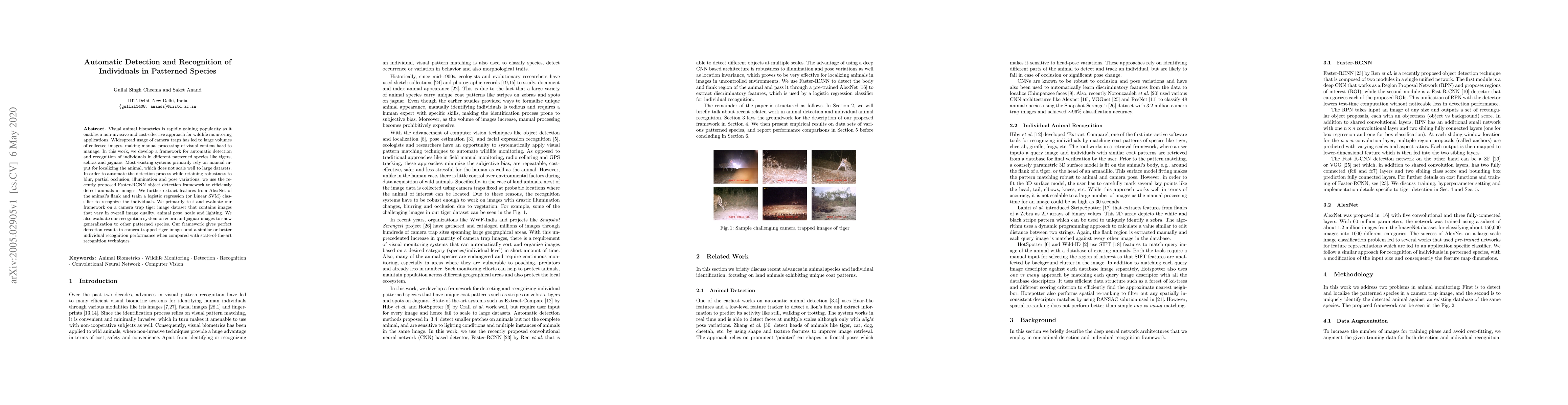This paper presents an automated framework for detecting and recognizing individuals in patterned species like tigers, zebras, and jaguars using camera trap images. It employs Faster-RCNN for object detection and a logistic regression or Linear SVM classifier for individual recognition, achieving high accuracy and robustness to various image conditions.