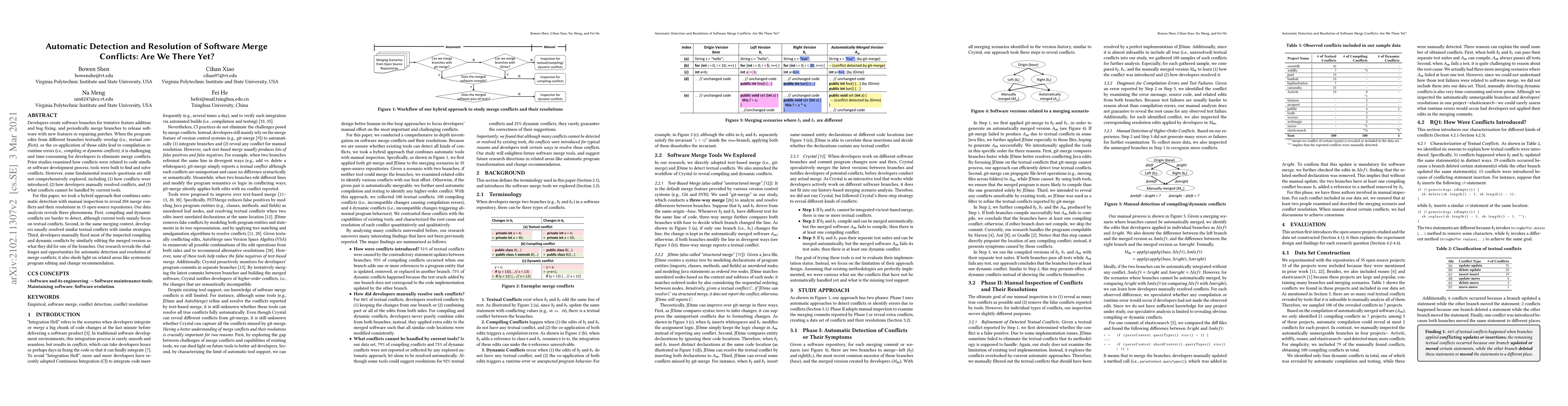 This paper investigates the challenges of automatic detection and resolution of software merge conflicts through a hybrid approach combining automated tools and manual inspection in 15 open-source projects. It reveals that while current tools focus on textual conflicts, compiling and dynamic conflicts are harder to detect and resolve, highlighting the need for improved automatic conflict resolution methods.
