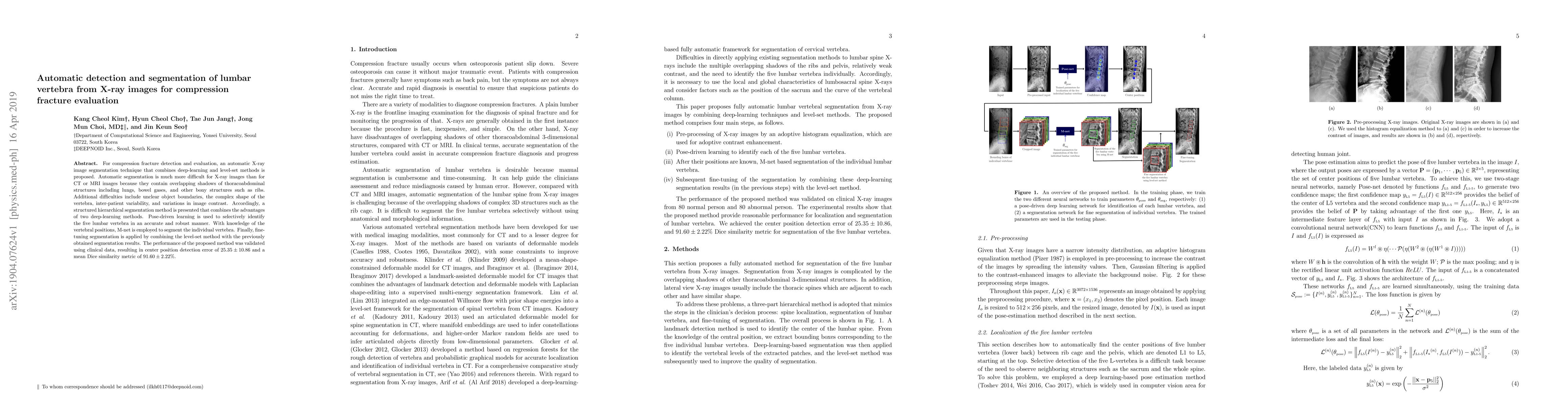 This paper proposes an automatic X-ray image segmentation technique combining deep learning and level-set methods for lumbar vertebra detection and compression fracture evaluation. The method uses pose-driven learning to identify lumbar vertebrae and M-net for segmentation, followed by fine-tuning with a level-set method, achieving a mean Dice similarity of 91.60% and a center position detection error of $25.35\pm10.86$.