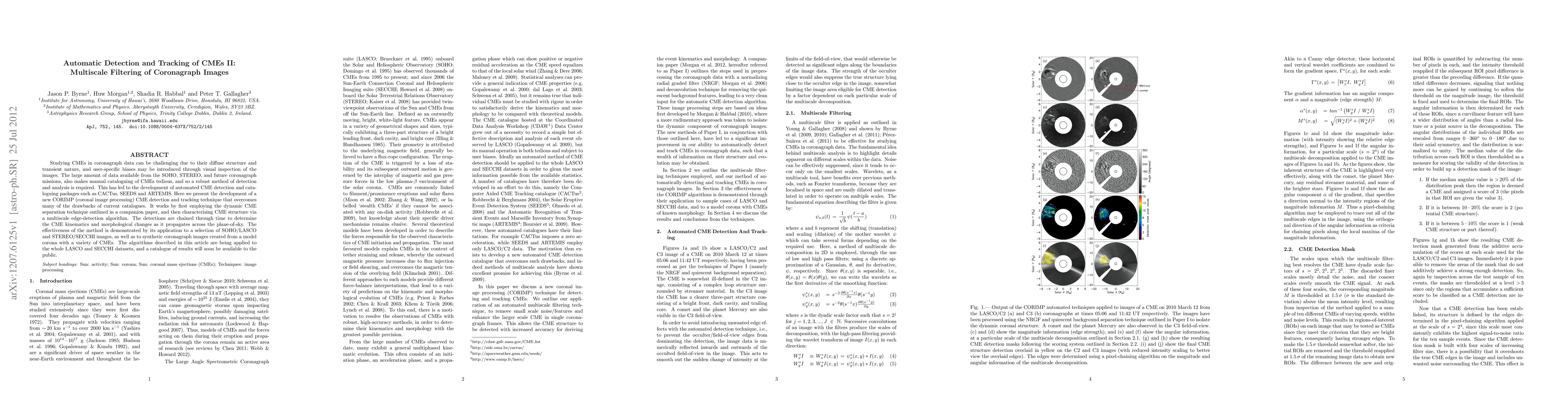 This paper introduces a new automated CME detection and tracking technique using multiscale filtering of coronagraph data, overcoming limitations of current methods. The technique employs a multiscale edge-detection algorithm to characterize CME structure and track them through time, validated with SOHO/LASCO, STEREO/SECCHI, and synthetic images.