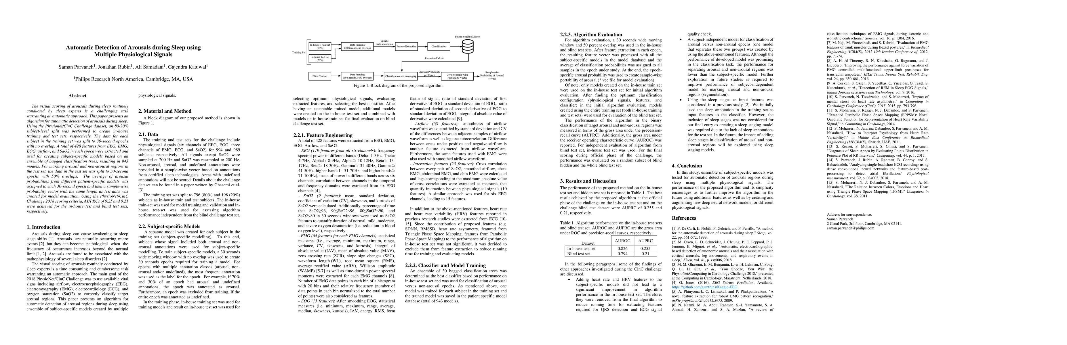 A machine learning algorithm accurately detects arousals during sleep using EEG, EMG, EOG, airflow, and SaO2 signals, achieving AUPRCs of 0.25 and 0.21 in internal and blind tests.
