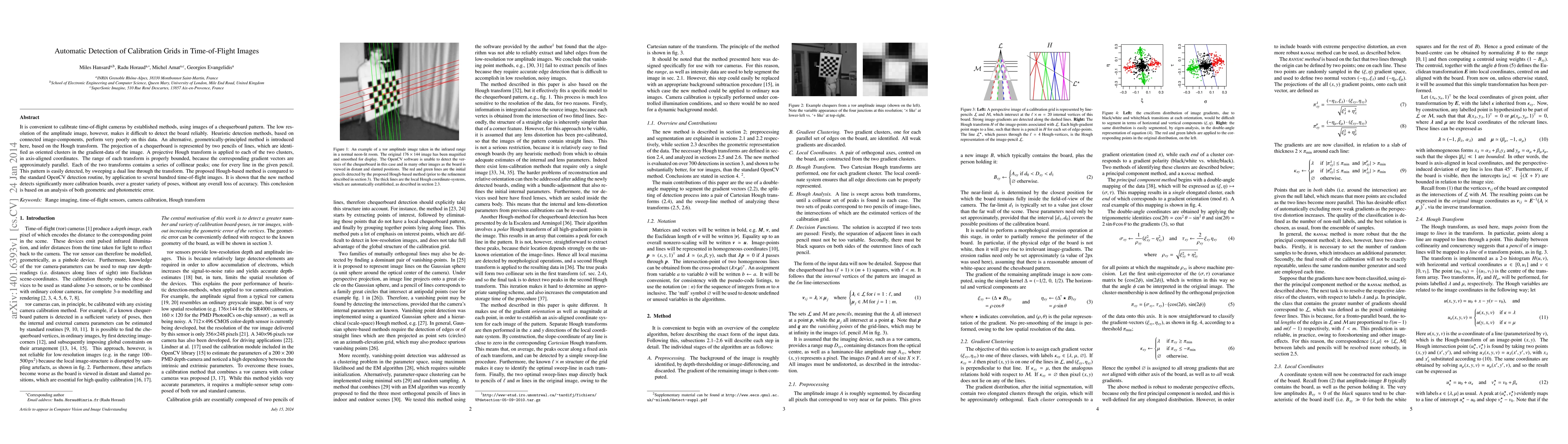 It is convenient to calibrate time-of-flight cameras by established methods, using images of a chequerboard pattern. The low resolution of the amplitude image, however, makes it difficult to detect the board reliably. Heuristic detection methods, based on connected image-components, perform very poorly on this data. An alternative, geometrically-principled method is introduced here, based on the Hough transform. The projection of a chequerboard is represented by two pencils of lines, which are identified as oriented clusters in the gradient-data of the image. A projective Hough transform is applied to each of the two clusters, in axis-aligned coordinates. The range of each transform is properly bounded, because the corresponding gradient vectors are approximately parallel. Each of the two transforms contains a series of collinear peaks; one for every line in the given pencil. This pattern is easily detected, by sweeping a dual line through the transform. The proposed Hough-based method is compared to the standard OpenCV detection routine, by application to several hundred time-of-flight images. It is shown that the new method detects significantly more calibration boards, over a greater variety of poses, without any overall loss of accuracy. This conclusion is based on an analysis of both geometric and photometric error.