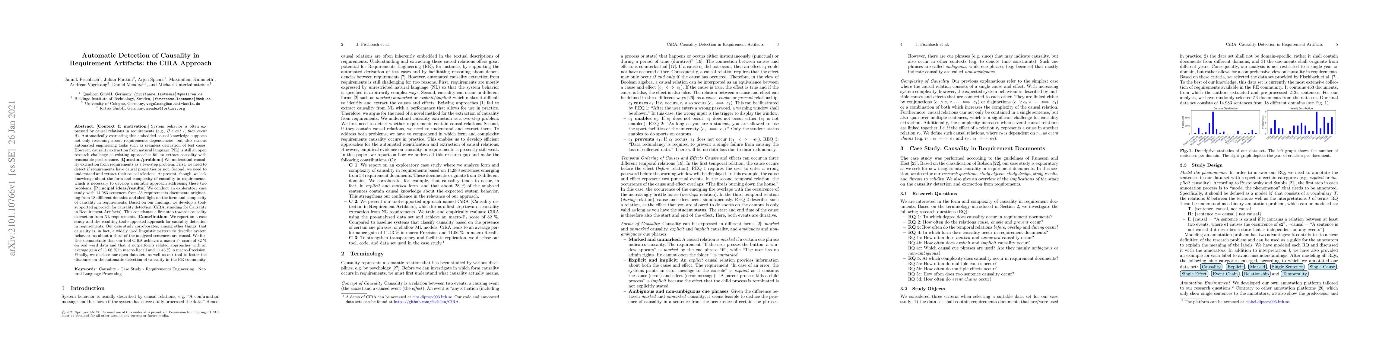 The paper explores the automatic detection of causality in requirement artifacts using a new approach called CiRA. Through a case study analyzing 14,983 sentences from diverse domains, the authors reveal that causality is a common pattern in requirements, used in about a third of the sentences. CiRA achieves an 82% macro-F1 score, significantly outperforming existing methods.