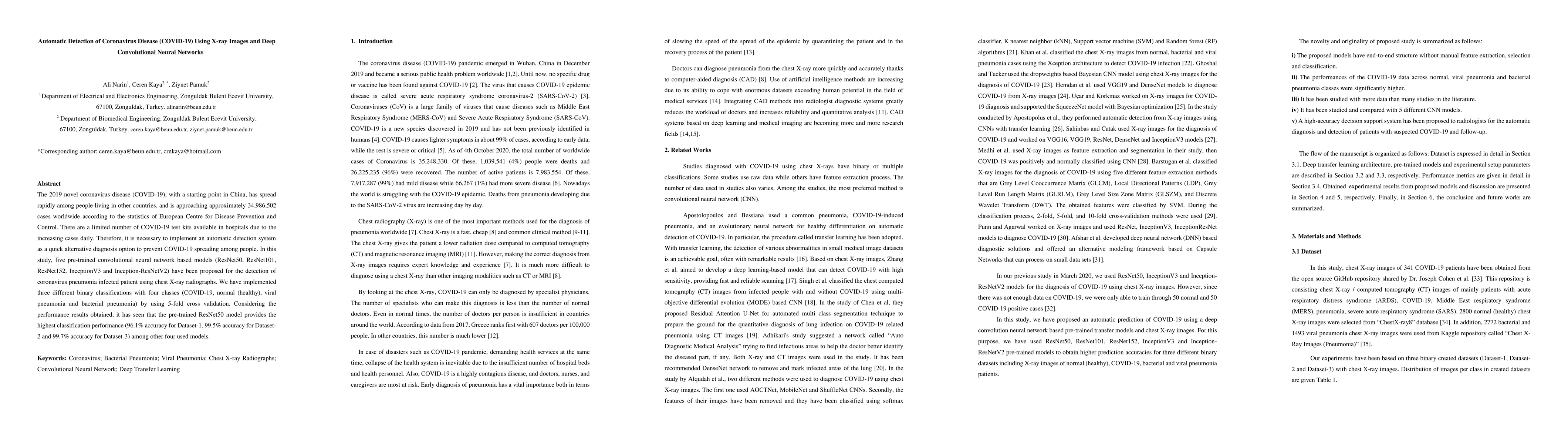 The 2019 novel coronavirus disease (COVID-19), with a starting point in China, has spread rapidly among people living in other countries, and is approaching approximately 34,986,502 cases worldwide according to the statistics of European Centre for Disease Prevention and Control. There are a limited number of COVID-19 test kits available in hospitals due to the increasing cases daily. Therefore, it is necessary to implement an automatic detection system as a quick alternative diagnosis option to prevent COVID-19 spreading among people. In this study, five pre-trained convolutional neural network based models (ResNet50, ResNet101, ResNet152, InceptionV3 and Inception-ResNetV2) have been proposed for the detection of coronavirus pneumonia infected patient using chest X-ray radiographs. We have implemented three different binary classifications with four classes (COVID-19, normal (healthy), viral pneumonia and bacterial pneumonia) by using 5-fold cross validation. Considering the performance results obtained, it has seen that the pre-trained ResNet50 model provides the highest classification performance (96.1% accuracy for Dataset-1, 99.5% accuracy for Dataset-2 and 99.7% accuracy for Dataset-3) among other four used models.