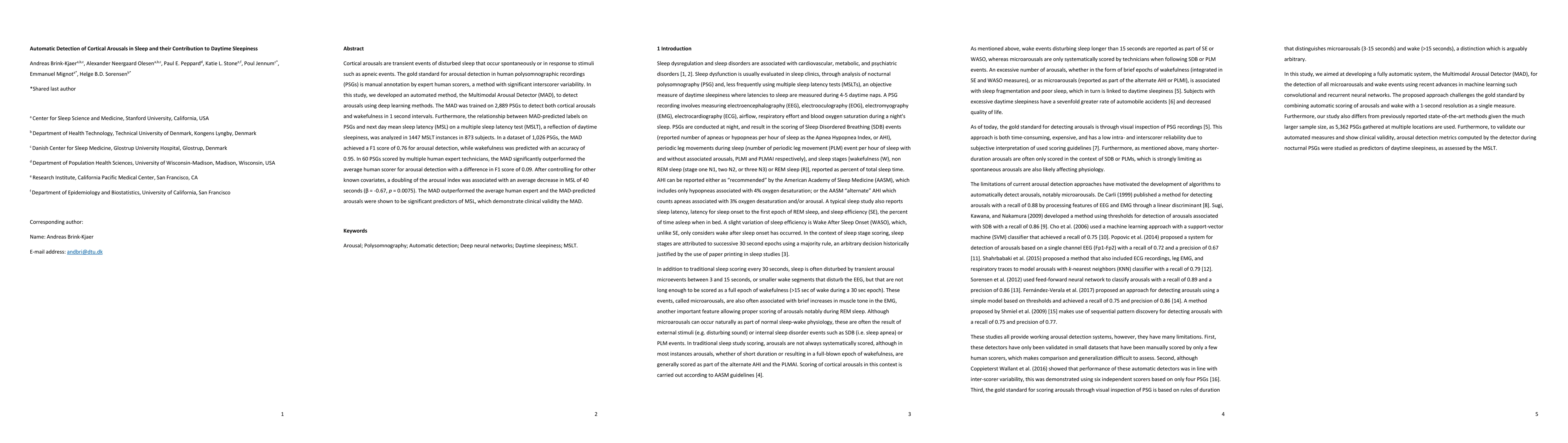 The study introduces the Multimodal Arousal Detector (MAD), a deep learning method achieving an F1 score of 0.76 for cortical arousal detection in sleep studies, surpassing average human scorers by 0.09. MAD also accurately predicted wakefulness. The research links higher arousal index, as predicted by MAD, to increased daytime sleepiness, demonstrating clinical validity.