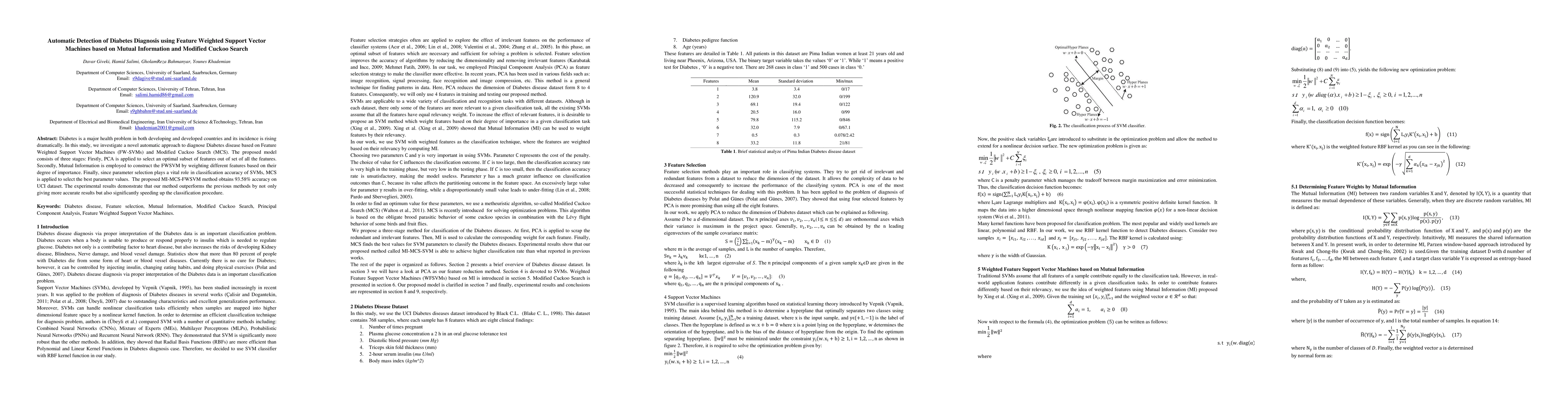 Diabetes is a major health problem in both developing and developed countries and its incidence is rising dramatically. In this study, we investigate a novel automatic approach to diagnose Diabetes disease based on Feature Weighted Support Vector Machines (FW-SVMs) and Modified Cuckoo Search (MCS). The proposed model consists of three stages: Firstly, PCA is applied to select an optimal subset of features out of set of all the features. Secondly, Mutual Information is employed to construct the FWSVM by weighting different features based on their degree of importance. Finally, since parameter selection plays a vital role in classification accuracy of SVMs, MCS is applied to select the best parameter values. The proposed MI-MCS-FWSVM method obtains 93.58% accuracy on UCI dataset. The experimental results demonstrate that our method outperforms the previous methods by not only giving more accurate results but also significantly speeding up the classification procedure.