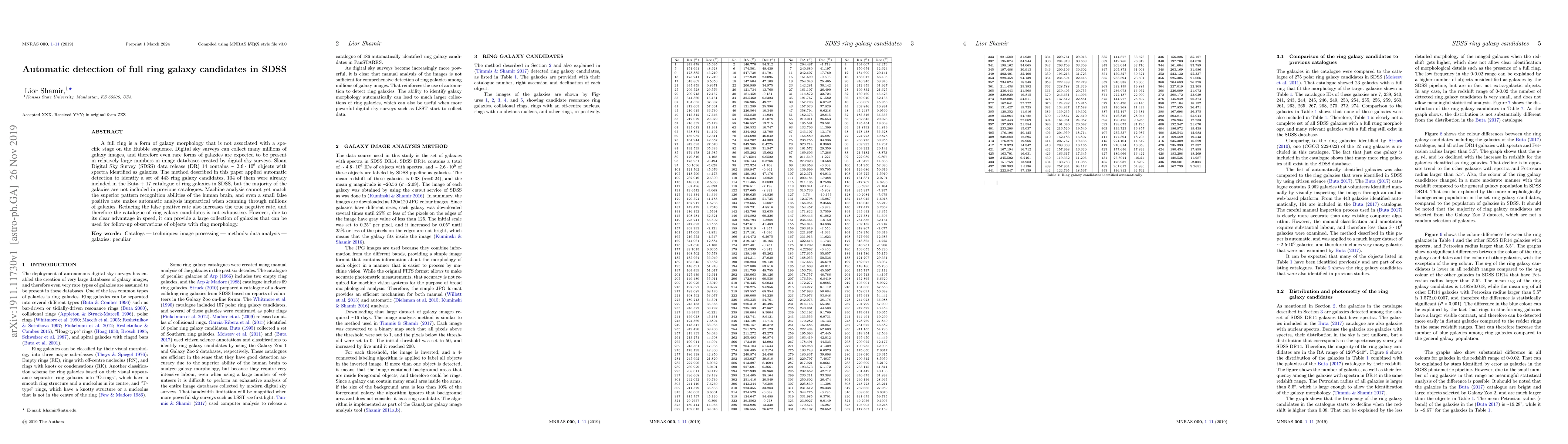 A full ring is a form of galaxy morphology that is not associated with a specific stage on the Hubble sequence. Digital sky surveys can collect many millions of galaxy images, and therefore even rare forms of galaxies are expected to be present in relatively large numbers in image databases created by digital sky surveys. Sloan Digital Sky Survey (SDSS) data release (DR) 14 contains ~2.6*10^6 objects with spectra identified as galaxies. The method described in this paper applied automatic detection to identify a set of 443 ring galaxy candidates, 104 of them were already included in the Buta + 17 catalogue of ring galaxies in SDSS, but the majority of the galaxies are not included in previous catalogues. Machine analysis cannot yet match the superior pattern recognition abilities of the human brain, and even a small false positive rate makes automatic analysis impractical when scanning through millions of galaxies. Reducing the false positive rate also increases the true negative rate, and therefore the catalogue of ring galaxy candidates is not exhaustive. However, due to its clear advantage in speed, it can provide a large collection of galaxies that can be used for follow-up observations of objects with ring morphology.