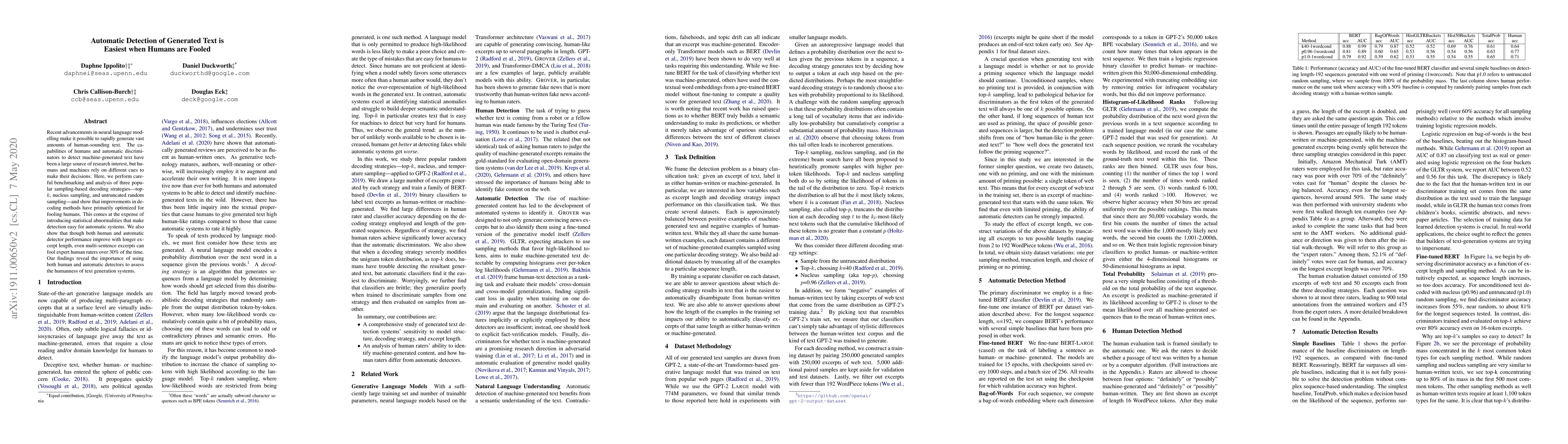 Recent advancements in neural language modelling make it possible to rapidly generate vast amounts of human-sounding text. The capabilities of humans and automatic discriminators to detect machine-generated text have been a large source of research interest, but humans and machines rely on different cues to make their decisions. Here, we perform careful benchmarking and analysis of three popular sampling-based decoding strategies---top-$k$, nucleus sampling, and untruncated random sampling---and show that improvements in decoding methods have primarily optimized for fooling humans. This comes at the expense of introducing statistical abnormalities that make detection easy for automatic systems. We also show that though both human and automatic detector performance improve with longer excerpt length, even multi-sentence excerpts can fool expert human raters over 30% of the time. Our findings reveal the importance of using both human and automatic detectors to assess the humanness of text generation systems.
