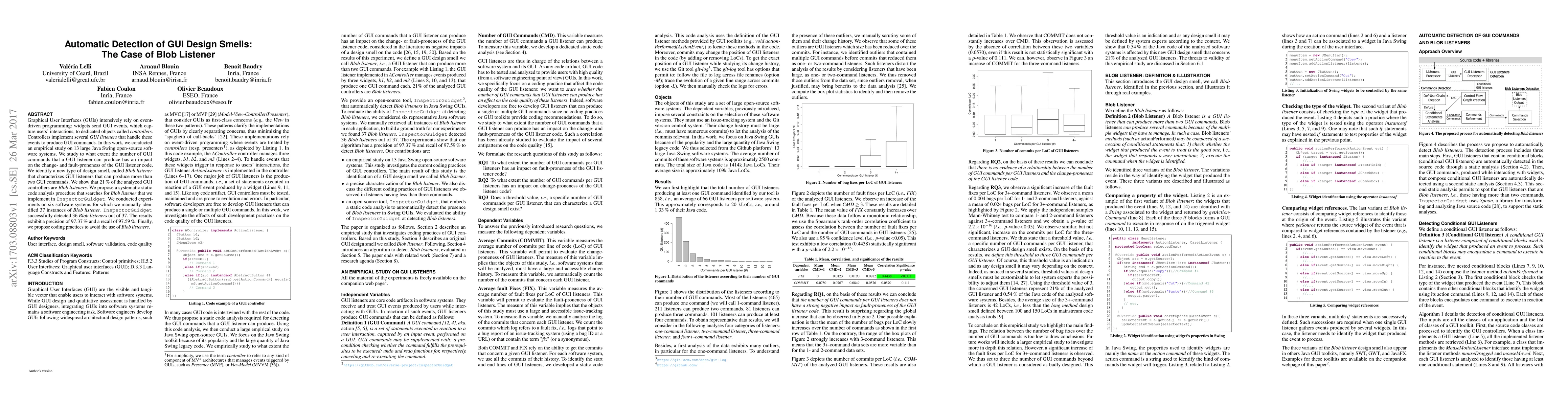 Graphical User Interfaces (GUIs) intensively rely on event-driven programming: widgets send GUI events, which capture users' interactions, to dedicated objects called controllers. Controllers implement several GUI listeners that handle these events to produce GUI commands. In this work, we conducted an empirical study on 13 large Java Swing open-source software systems. We study to what extent the number of GUI commands that a GUI listener can produce has an impact on the change-and fault-proneness of the GUI listener code. We identify a new type of design smell, called Blob listener that characterizes GUI listeners that can produce more than two GUI commands. We show that 21 % of the analyzed GUI controllers are Blob listeners. We propose a systematic static code analysis procedure that searches for Blob listener that we implement in InspectorGuidget. We conducted experiments on six software systems for which we manually identified 37 instances of Blob listener. InspectorGuidget successfully detected 36 Blob listeners out of 37. The results exhibit a precision of 97.37 % and a recall of 97.59 %. Finally, we propose coding practices to avoid the use of Blob listeners.