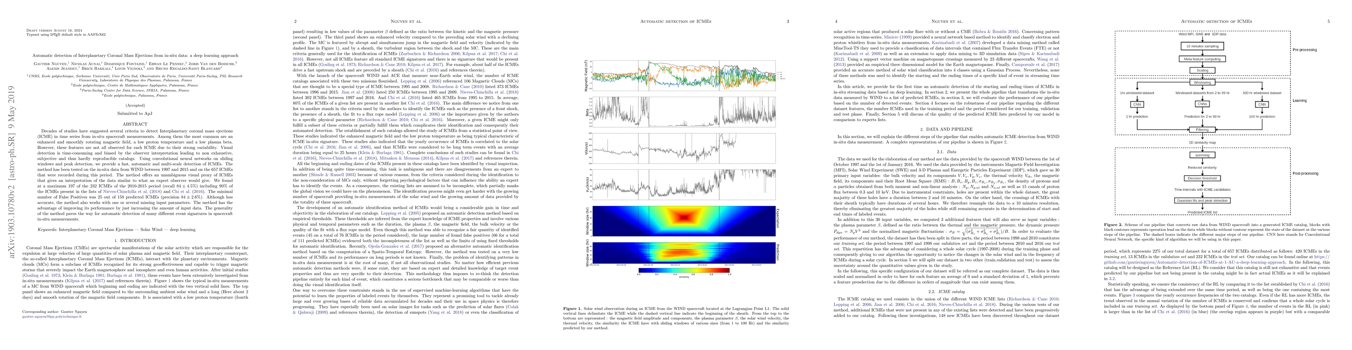Decades of studies have suggested several criteria to detect Interplanetary coronal mass ejections (ICME) in time series from in-situ spacecraft measurements. Among them the most common are an enhanced and smoothly rotating magnetic field, a low proton temperature and a low plasma beta. However, these features are not all observed for each ICME due to their strong variability. Visual detection is time-consuming and biased by the observer interpretation leading to non exhaustive, subjective and thus hardly reproducible catalogs. Using convolutional neural networks on sliding windows and peak detection, we provide a fast, automatic and multi-scale detection of ICMEs. The method has been tested on the in-situ data from WIND between 1997 and 2015 and on the 657 ICMEs that were recorded during this period. The method offers an unambiguous visual proxy of ICMEs that gives an interpretation of the data similar to what an expert observer would give. We found at a maximum 197 of the 232 ICMEs of the 2010-2015 period (recall 84 +-4.5 % including 90% of the ICMEs present in the lists of Nieves-Chinchilla et al. (2015) and Chi et al. (2016). The minimal number of False Positives was 25 out of 158 predicted ICMEs (precision 84+-2.6%). Although less accurate, the method also works with one or several missing input parameters. The method has the advantage of improving its performance by just increasing the amount of input data. The generality of the method paves the way for automatic detection of many different event signatures in spacecraft in-situ measurements.