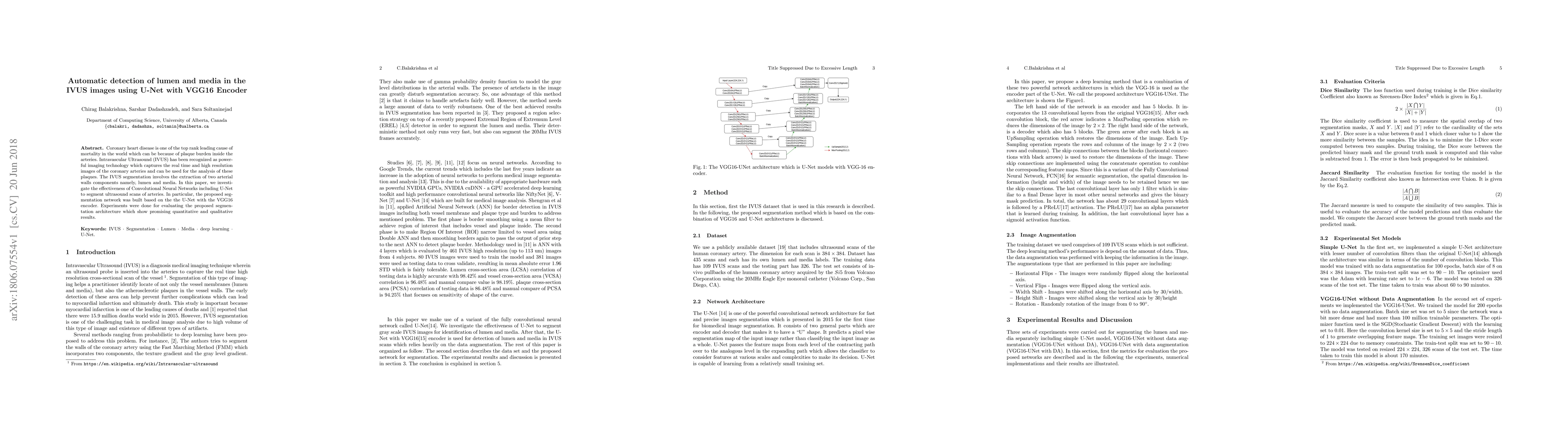 Coronary heart disease is one of the top rank leading cause of mortality in the world which can be because of plaque burden inside the arteries. Intravascular Ultrasound (IVUS) has been recognized as power- ful imaging technology which captures the real time and high resolution images of the coronary arteries and can be used for the analysis of these plaques. The IVUS segmentation involves the extraction of two arterial walls components namely, lumen and media. In this paper, we investi- gate the effectiveness of Convolutional Neural Networks including U-Net to segment ultrasound scans of arteries. In particular, the proposed seg- mentation network was built based on the the U-Net with the VGG16 encoder. Experiments were done for evaluating the proposed segmen- tation architecture which show promising quantitative and qualitative results.