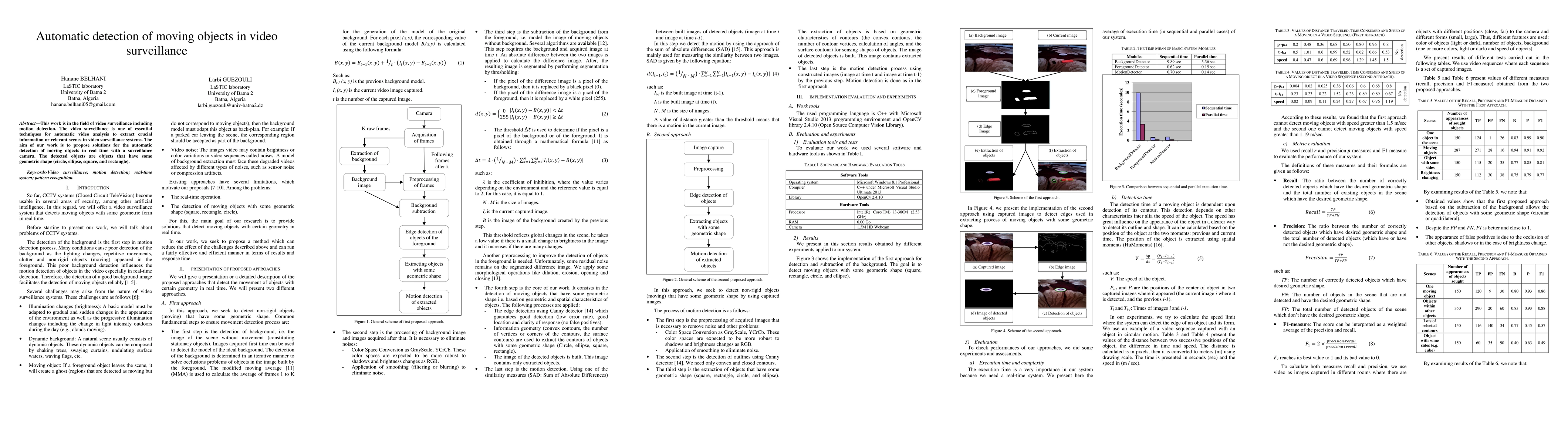 This work is in the field of video surveillance including motion detection. The video surveillance is one of essential techniques for automatic video analysis to extract crucial information or relevant scenes in video surveillance systems. The aim of our work is to propose solutions for the automatic detection of moving objects in real time with a surveillance camera. The detected objects are objects that have some geometric shape (circle, ellipse, square, and rectangle).