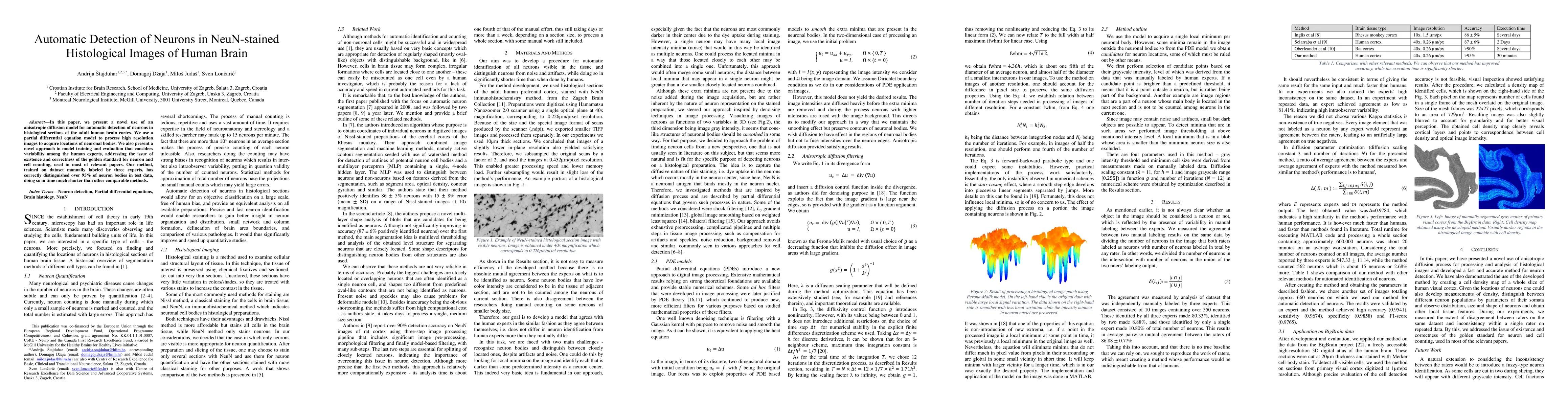 In this paper, we present a novel use of an anisotropic diffusion model for automatic detection of neurons in histological sections of the adult human brain cortex. We use a partial differential equation model to process high resolution images to acquire locations of neuronal bodies. We also present a novel approach in model training and evaluation that considers variability among the human experts, addressing the issue of existence and correctness of the golden standard for neuron and cell counting, used in most of relevant papers. Our method, trained on dataset manually labeled by three experts, has correctly distinguished over 95% of neuron bodies in test data, doing so in time much shorter than other comparable methods.