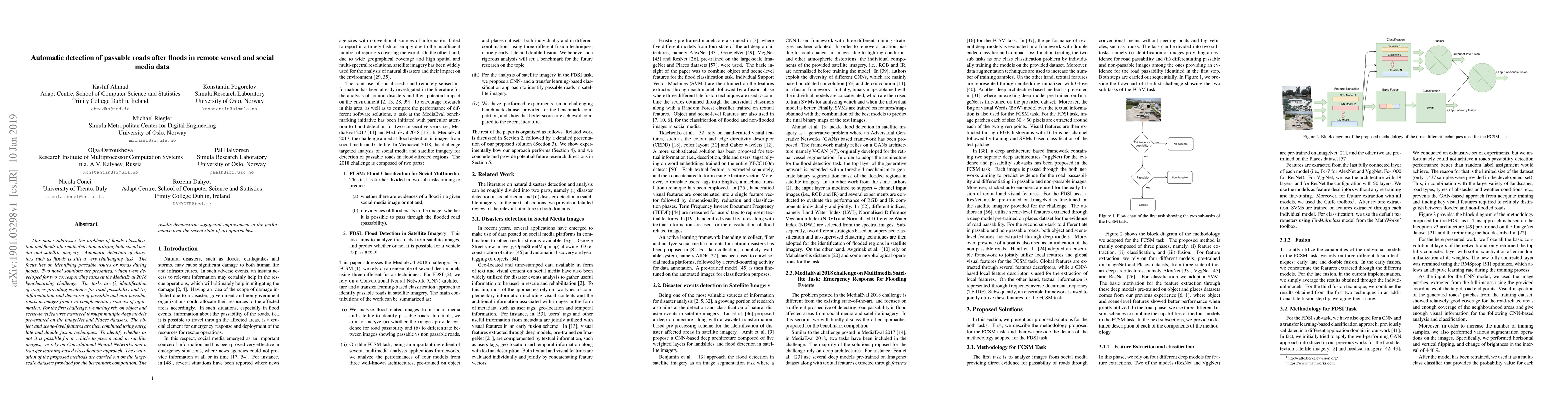 This paper presents novel solutions for detecting passable roads after floods using social media and satellite imagery, leveraging deep learning models and fusion techniques. The proposed methods significantly outperform existing approaches in identifying passable routes in flood aftermath scenarios.