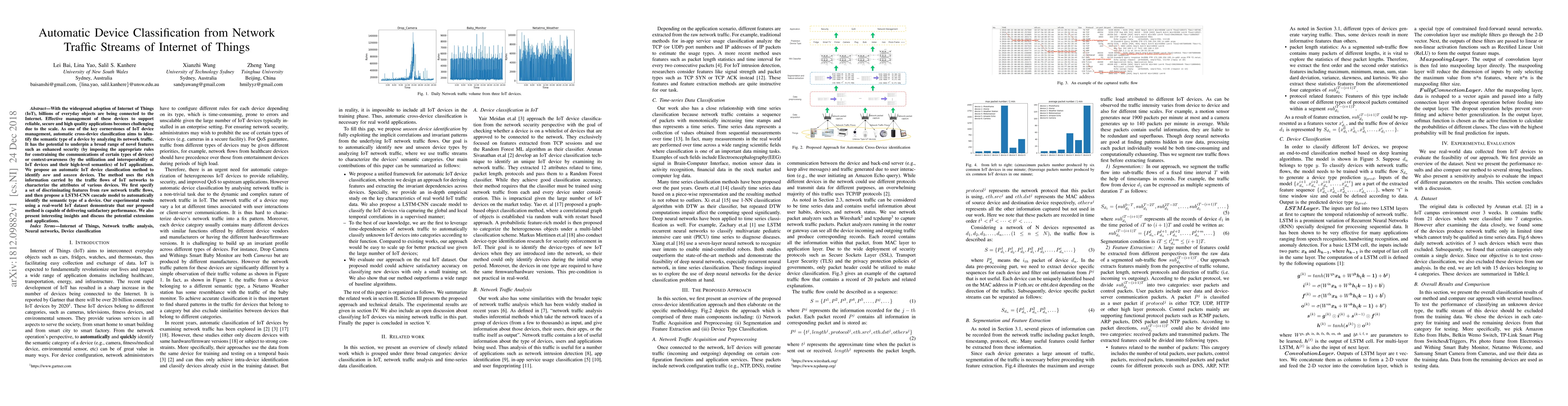 With the widespread adoption of Internet of Things (IoT), billions of everyday objects are being connected to the Internet. Effective management of these devices to support reliable, secure and high quality applications becomes challenging due to the scale. As one of the key cornerstones of IoT device management, automatic cross-device classification aims to identify the semantic type of a device by analyzing its network traffic. It has the potential to underpin a broad range of novel features such as enhanced security (by imposing the appropriate rules for constraining the communications of certain types of devices) or context-awareness (by the utilization and interoperability of IoT devices and their high-level semantics) of IoT applications. We propose an automatic IoT device classification method to identify new and unseen devices. The method uses the rich information carried by the traffic flows of IoT networks to characterize the attributes of various devices. We first specify a set of discriminating features from raw network traffic flows, and then propose a LSTM-CNN cascade model to automatically identify the semantic type of a device. Our experimental results using a real-world IoT dataset demonstrate that our proposed method is capable of delivering satisfactory performance. We also present interesting insights and discuss the potential extensions and applications.