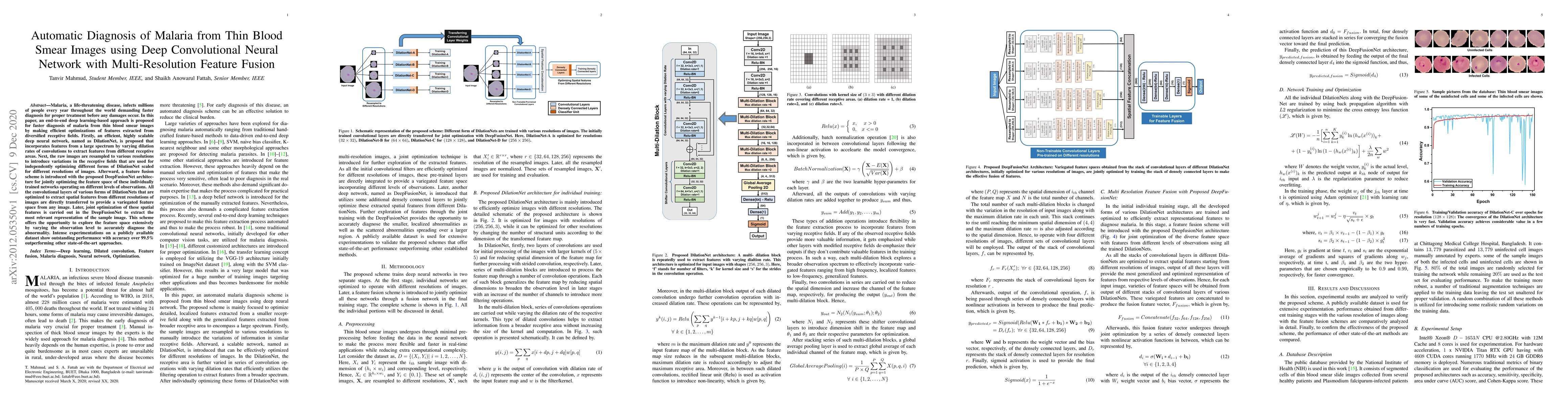 This paper proposes an advanced deep learning method for automatic malaria diagnosis from thin blood smear images, utilizing a DilationNet with multi-resolution feature fusion. The approach achieves over 99.5% accuracy by optimizing features from various receptive fields and integrating them through DeepFusionNet.