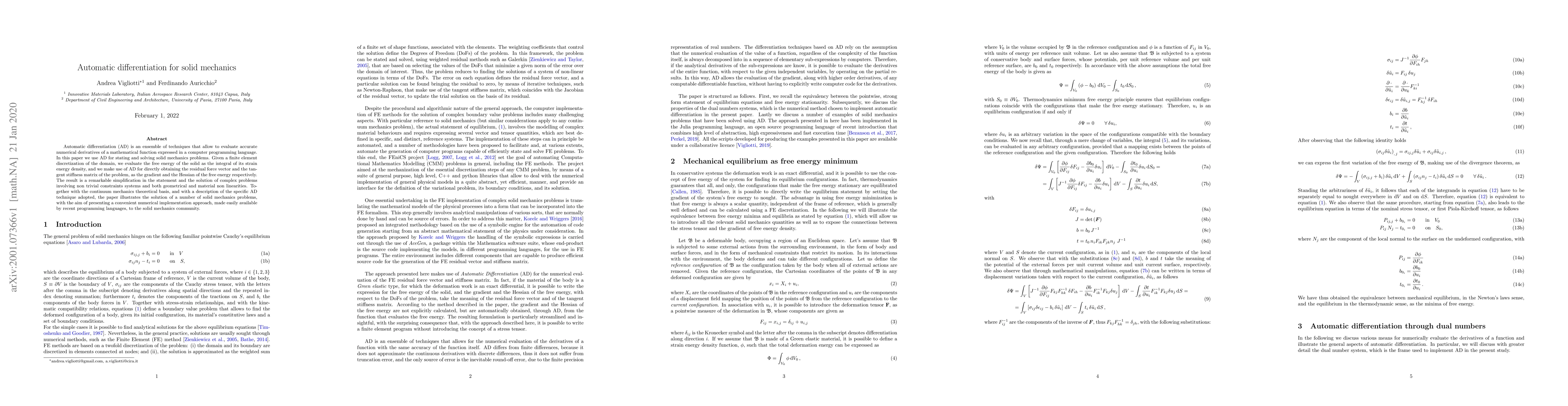This paper employs automatic differentiation (AD) to simplify the evaluation of numerical derivatives in solid mechanics problems, directly obtaining residual forces and stiffness matrices. The method facilitates the handling of complex constraints and nonlinearities, offering a practical implementation for the solid mechanics community.