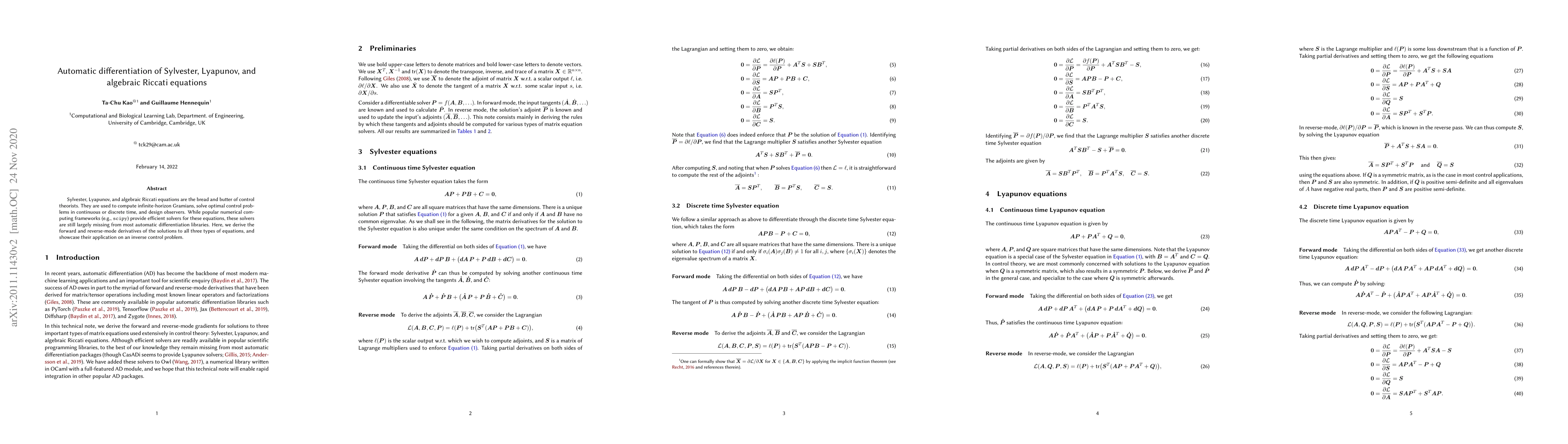 This paper derives forward and reverse-mode automatic differentiation for solutions to Sylvester, Lyapunov, and algebraic Riccati equations, which are fundamental in control theory. It demonstrates the practical application of these derivatives in solving an inverse control problem.