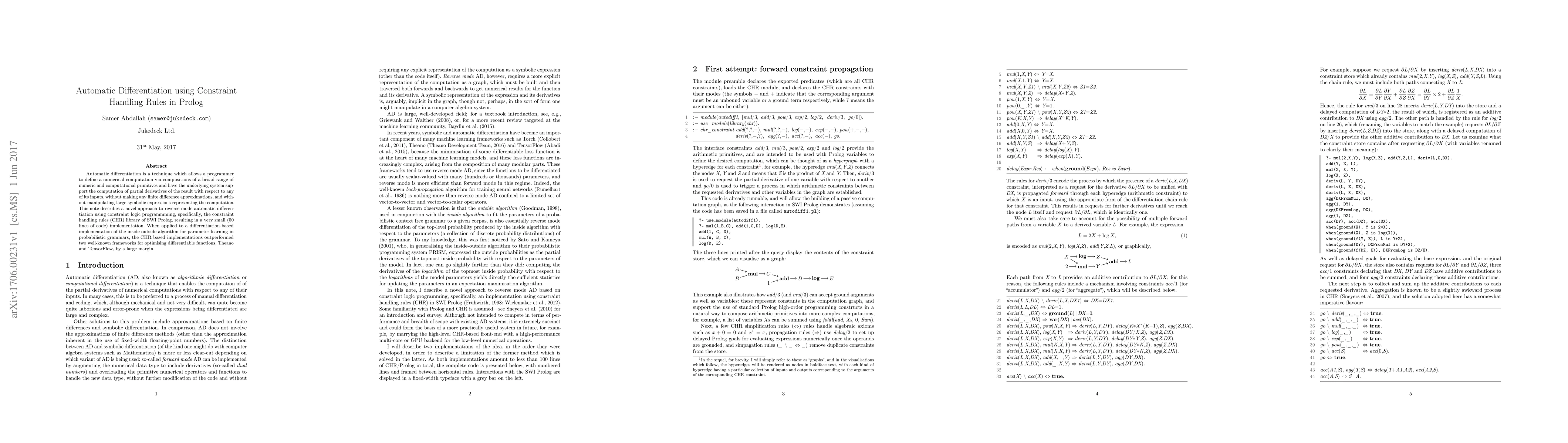 This paper presents a concise 50-line Prolog implementation of reverse mode automatic differentiation using Constraint Handling Rules, which outperforms Theano and TensorFlow in differentiating a probabilistic grammar model. The approach avoids finite difference approximations and large symbolic expressions.