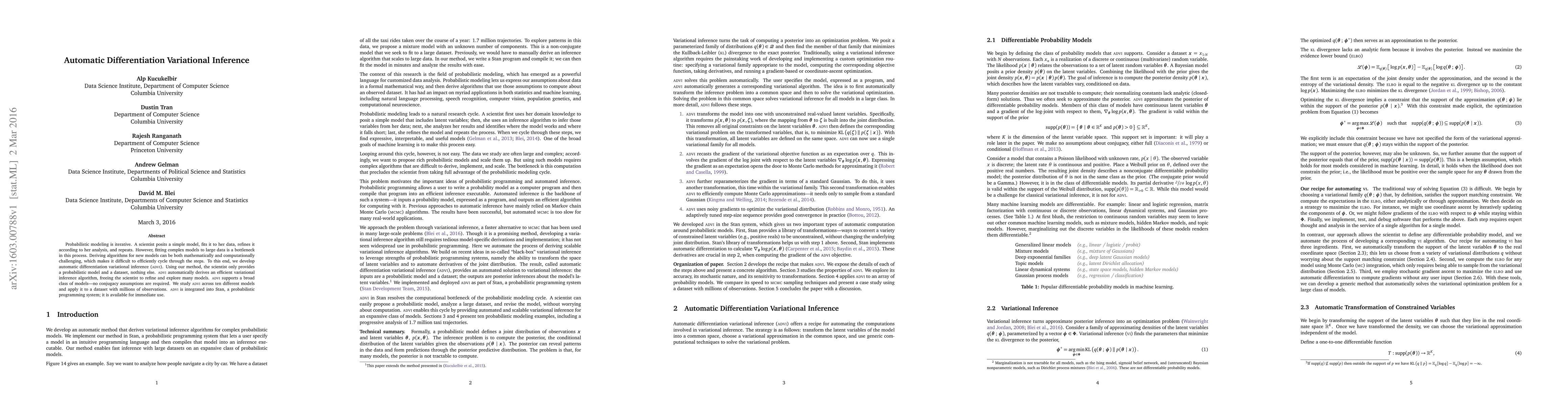 Automatic Differentiation Variational Inference (ADVI) automates the derivation of efficient variational inference algorithms for complex probabilistic models, eliminating the need for manual algorithm development and enabling rapid model refinement. ADVI is integrated into Stan and supports a wide range of models without requiring conjugacy assumptions.