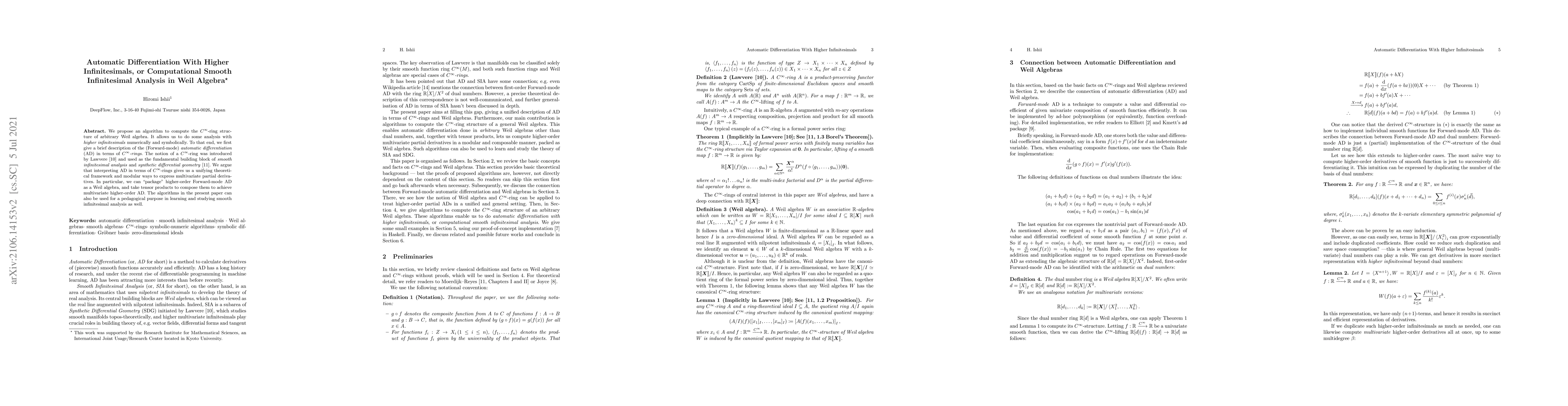 This paper proposes an algorithm for computing the $C^\infty$-ring structure of Weil algebra, enabling both numerical and symbolic analysis with higher infinitesimals. It interprets automatic differentiation in terms of $C^\infty$-rings, providing a unifying framework for expressing multivariate partial derivatives and facilitating higher-order AD through tensor products.
