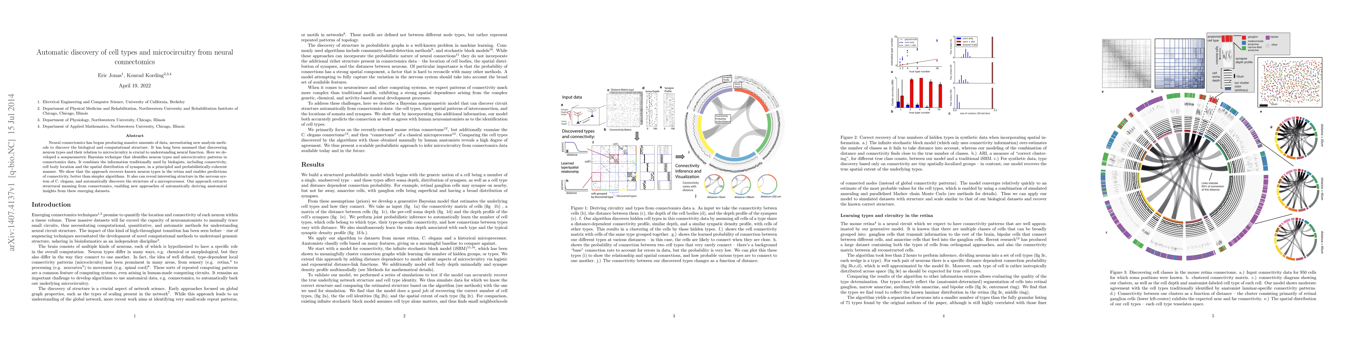Neural connectomics has begun producing massive amounts of data, necessitating new analysis methods to discover the biological and computational structure. It has long been assumed that discovering neuron types and their relation to microcircuitry is crucial to understanding neural function. Here we developed a nonparametric Bayesian technique that identifies neuron types and microcircuitry patterns in connectomics data. It combines the information traditionally used by biologists, including connectivity, cell body location and the spatial distribution of synapses, in a principled and probabilistically-coherent manner. We show that the approach recovers known neuron types in the retina and enables predictions of connectivity, better than simpler algorithms. It also can reveal interesting structure in the nervous system of C. elegans, and automatically discovers the structure of a microprocessor. Our approach extracts structural meaning from connectomics, enabling new approaches of automatically deriving anatomical insights from these emerging datasets.