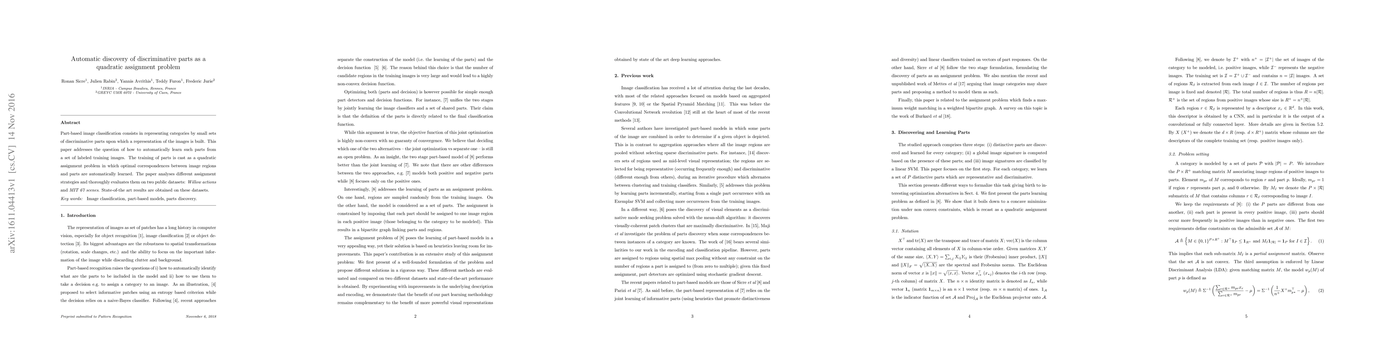 Part-based image classification consists in representing categories by small sets of discriminative parts upon which a representation of the images is built. This paper addresses the question of how to automatically learn such parts from a set of labeled training images. The training of parts is cast as a quadratic assignment problem in which optimal correspondences between image regions and parts are automatically learned. The paper analyses different assignment strategies and thoroughly evaluates them on two public datasets: Willow actions and MIT 67 scenes. State-of-the art results are obtained on these datasets.