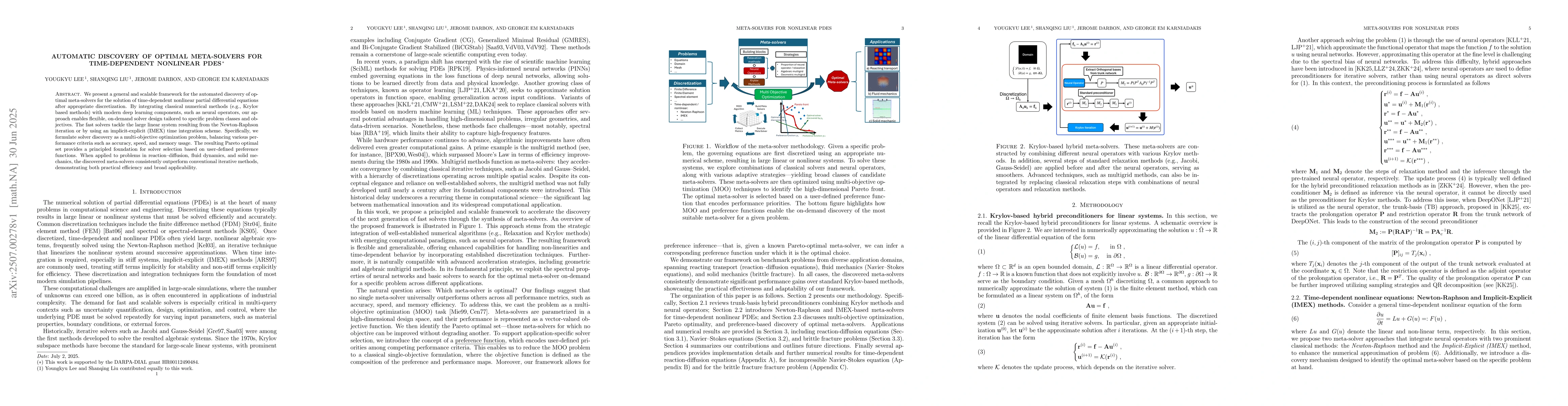 We present a general and scalable framework for the automated discovery of optimal meta-solvers for the solution of time-dependent nonlinear partial differential equations after appropriate discretization. By integrating classical numerical methods (e.g., Krylov-based methods) with modern deep learning components, such as neural operators, our approach enables flexible, on-demand solver design tailored to specific problem classes and objectives. The fast solvers tackle the large linear system resulting from the Newton--Raphson iteration or by using an implicit-explicit (IMEX) time integration scheme. Specifically, we formulate solver discovery as a multi-objective optimization problem, balancing various performance criteria such as accuracy, speed, and memory usage. The resulting Pareto optimal set provides a principled foundation for solver selection based on user-defined preference functions. When applied to problems in reaction--diffusion, fluid dynamics, and solid mechanics, the discovered meta-solvers consistently outperform conventional iterative methods, demonstrating both practical efficiency and broad applicability.