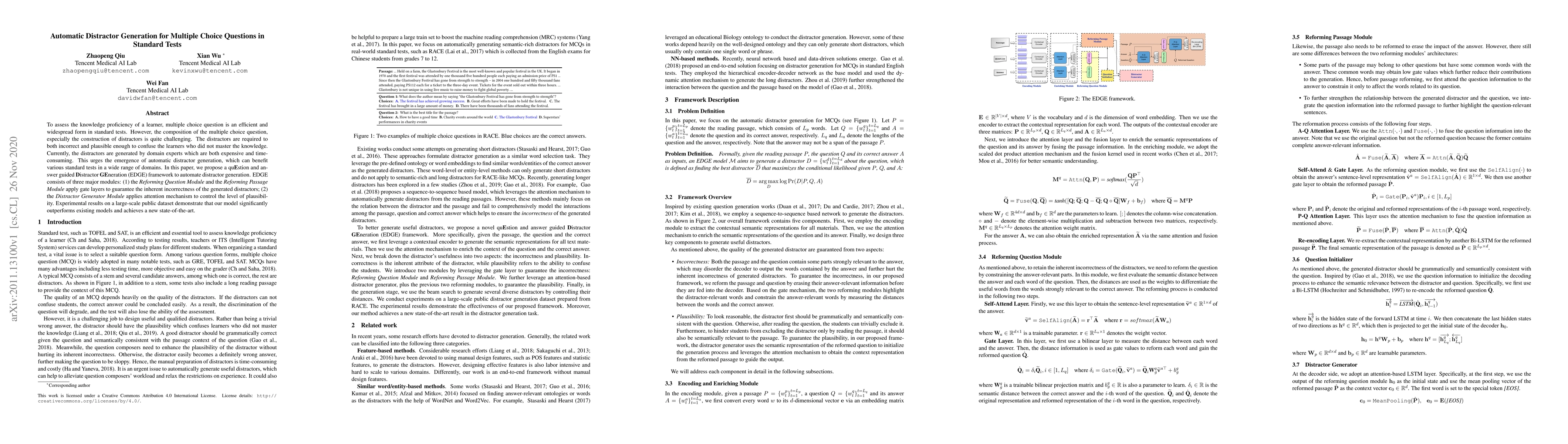 This paper proposes an automatic distractor generation framework (EDGE) to create plausible yet incorrect options for multiple-choice questions in standard tests. The EDGE framework includes modules for reformulating questions and passages to ensure incorrectness, and an attention-based distractor generator to manage plausibility, achieving state-of-the-art performance on a public dataset.