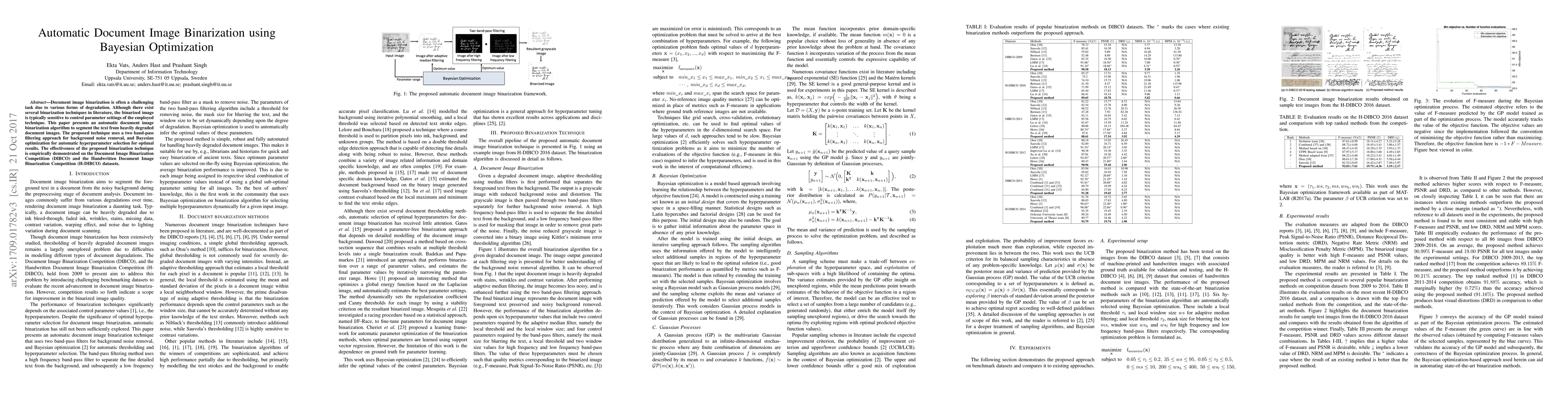 This paper introduces an automatic document image binarization method using Bayesian optimization for hyperparameter selection, combining two-band pass filtering for noise removal. The technique is validated on the DIBCO and H-DIBCO datasets, demonstrating its effectiveness in segmenting text from degraded documents.