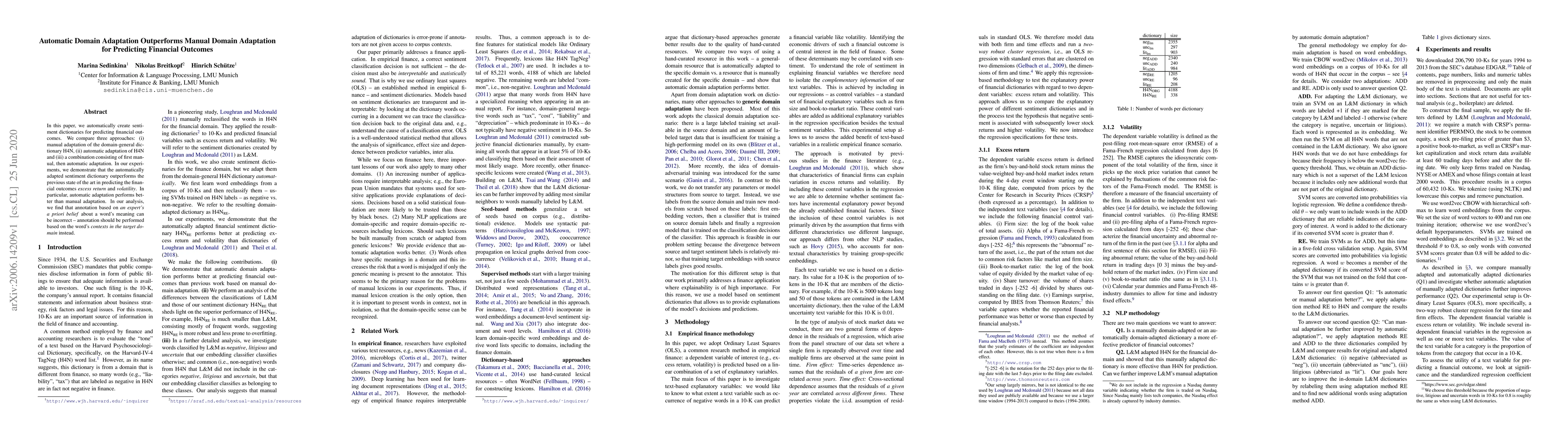 In this paper, we automatically create sentiment dictionaries for predicting financial outcomes. We compare three approaches: (I) manual adaptation of the domain-general dictionary H4N, (ii) automatic adaptation of H4N and (iii) a combination consisting of first manual, then automatic adaptation. In our experiments, we demonstrate that the automatically adapted sentiment dictionary outperforms the previous state of the art in predicting the financial outcomes excess return and volatility. In particular, automatic adaptation performs better than manual adaptation. In our analysis, we find that annotation based on an expert's a priori belief about a word's meaning can be incorrect -- annotation should be performed based on the word's contexts in the target domain instead.