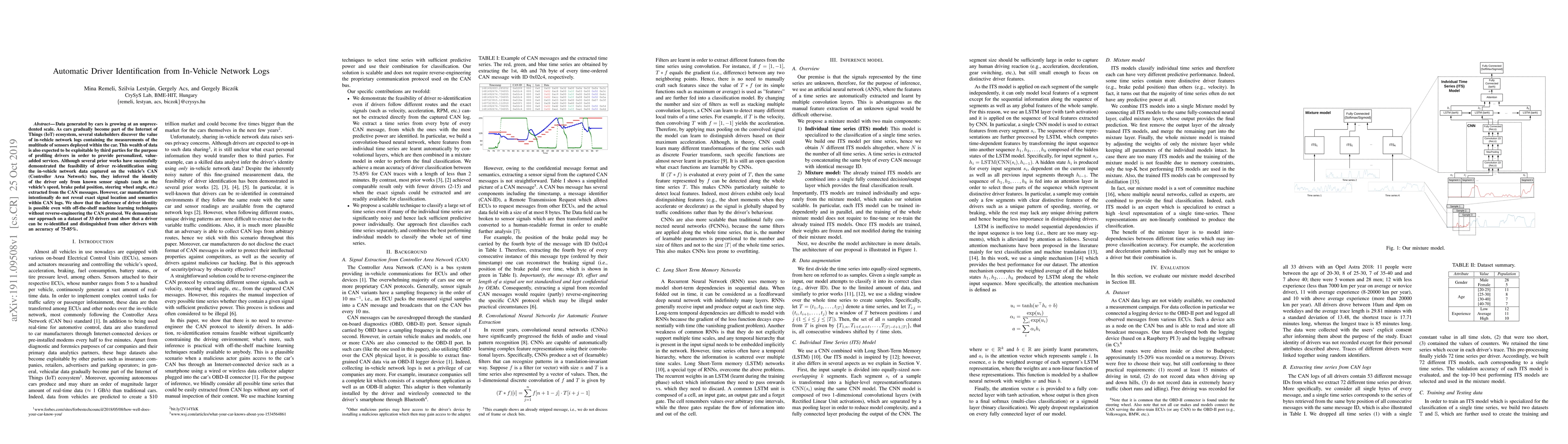 This paper presents a method for automatically identifying drivers from in-vehicle network logs using machine learning, without reverse-engineering the CAN protocol. The approach achieves driver re-identification with an accuracy of 75-85% using a dataset of 33 drivers.