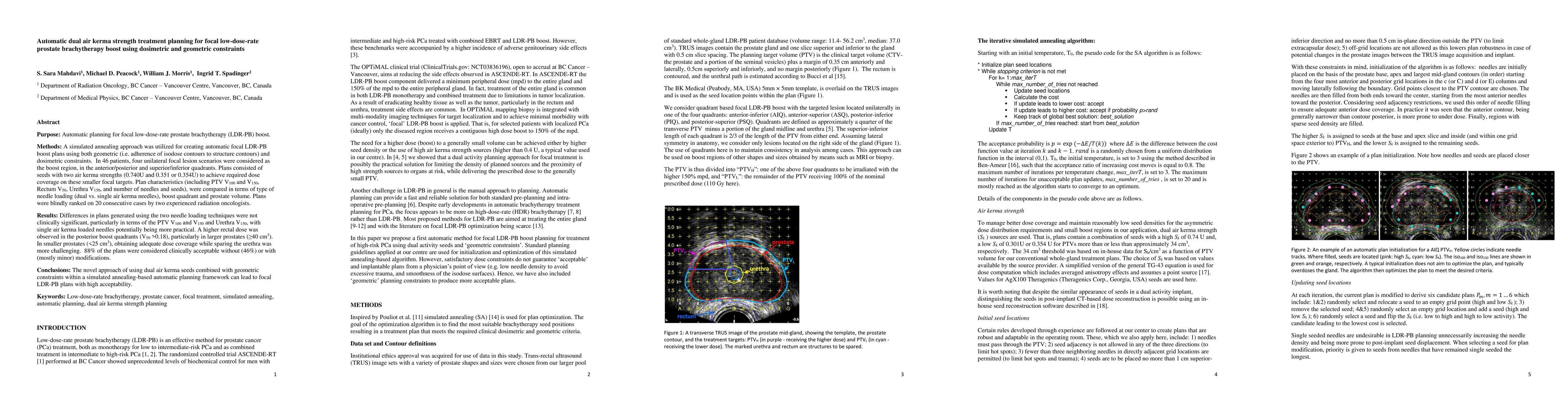 This study introduces an automatic planning method for focal low-dose-rate prostate brachytherapy using dual air kerma seeds and simulated annealing, achieving clinically acceptable plans with minimal rectal dose impact, though challenges remain in smaller prostates.