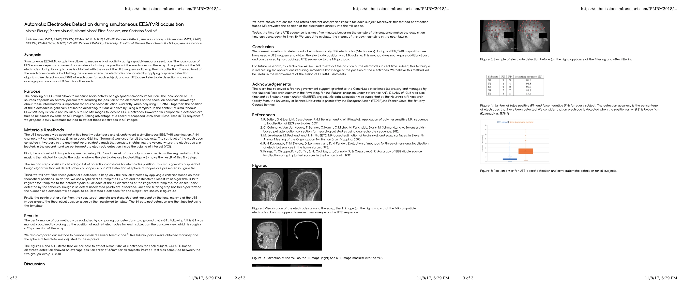 Simultaneous EEG/fMRI acquisition allows to measure brain activity at high spatial-temporal resolution. The localisation of EEG sources depends on several parameters including the position of the electrodes on the scalp. The position of the MR electrodes during its acquisitions is obtained with the use of the UTE sequence allowing their visualisation. The retrieval of the electrodes consists in obtaining the volume where the electrodes are located by applying a sphere detection algorithm. We detect around 90% of electrodes for each subject, and our UTE-based electrode detection showed an average position error of 3.7mm for all subjects.