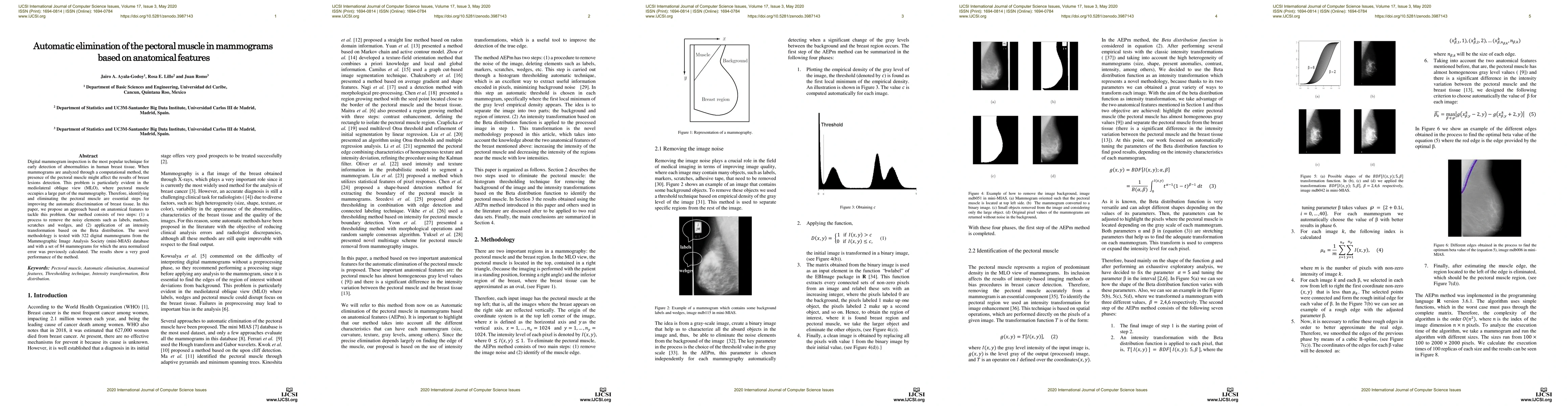 Digital mammogram inspection is the most popular technique for early detection of abnormalities in human breast tissue. When mammograms are analyzed through a computational method, the presence of the pectoral muscle might affect the results of breast lesions detection. This problem is particularly evident in the mediolateral oblique view (MLO), where pectoral muscle occupies a large part of the mammography. Therefore, identifying and eliminating the pectoral muscle are essential steps for improving the automatic discrimination of breast tissue. In this paper, we propose an approach based on anatomical features to tackle this problem. Our method consists of two steps: (1) a process to remove the noisy elements such as labels, markers, scratches and wedges, and (2) application of an intensity transformation based on the Beta distribution. The novel methodology is tested with 322 digital mammograms from the Mammographic Image Analysis Society (mini-MIAS) database and with a set of 84 mammograms for which the area normalized error was previously calculated. The results show a very good performance of the method.