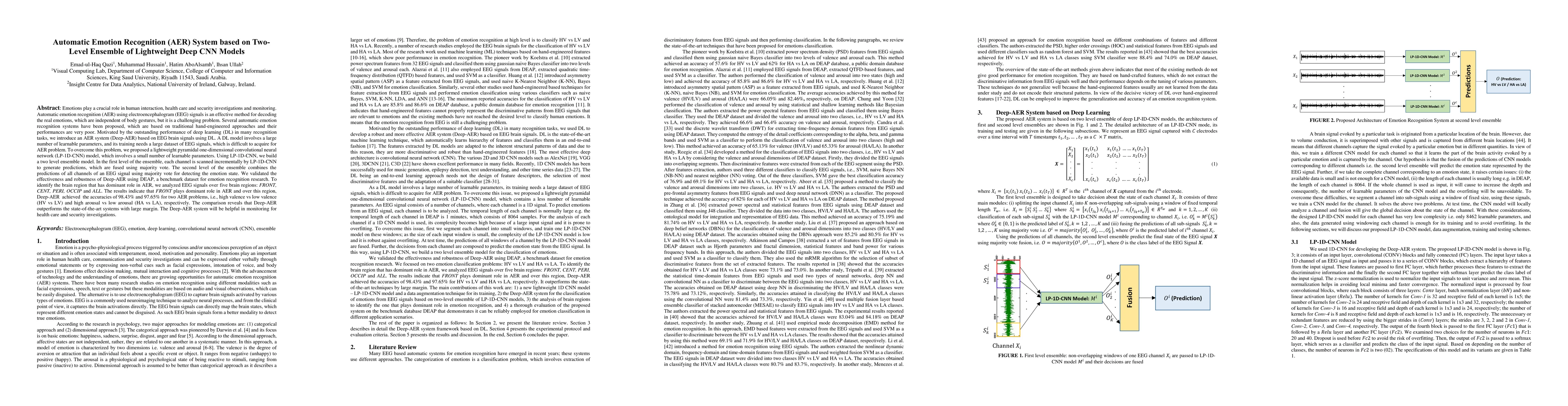 This paper proposes an Automatic Emotion Recognition (AER) system, Deep-AER, based on a lightweight pyramidal one-dimensional convolutional neural network (LP-1D-CNN) for EEG signal analysis. The system employs a two-level ensemble model to achieve high accuracy and outperforms existing methods, demonstrating potential applications in health care and security.
