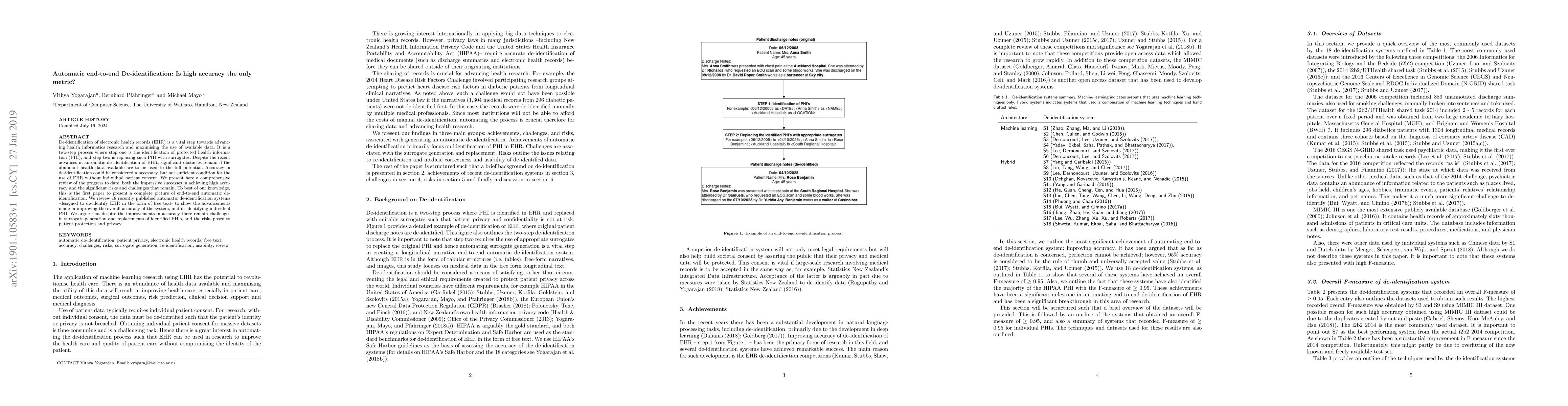 This paper reviews advancements in automatic end-to-end de-identification of electronic health records, highlighting the impressive accuracy improvements while also emphasizing the remaining challenges in surrogate generation and privacy risks. It argues that high accuracy alone is insufficient for fully utilizing health data without patient consent.