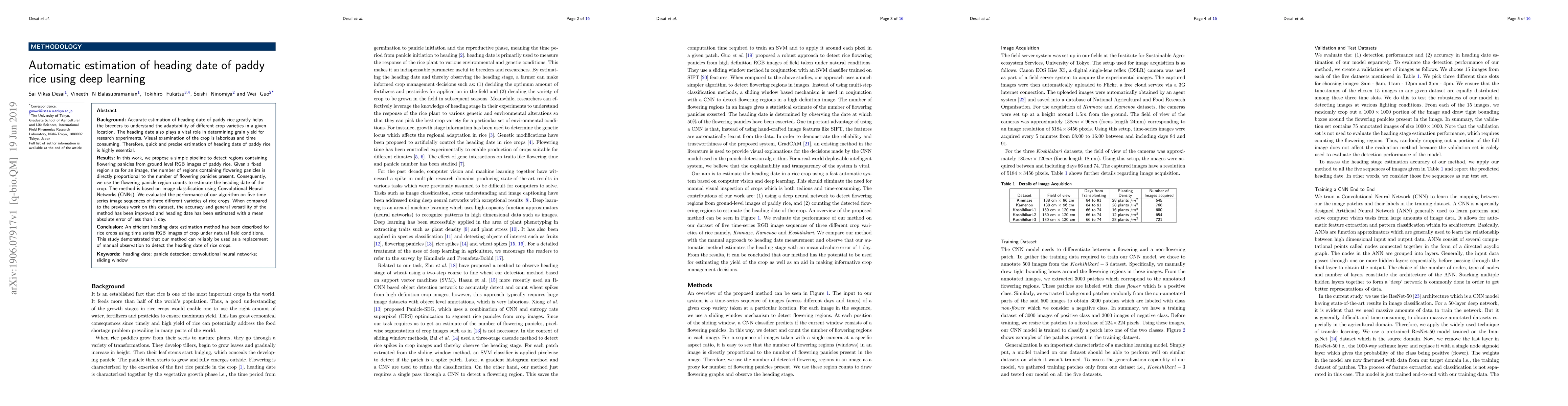 This paper proposes a deep learning method using Convolutional Neural Networks (CNNs) to automatically estimate the heading date of paddy rice by counting flowering panicles from ground-level RGB images. The method shows improved accuracy and versatility, estimating the heading date with a mean absolute error of less than 1 day.