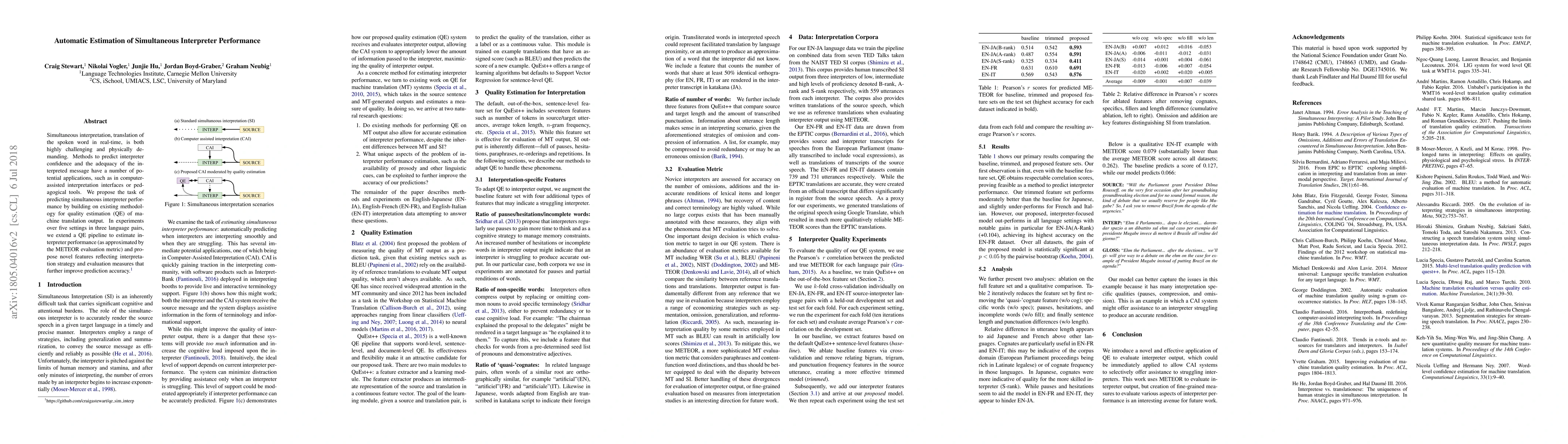 Simultaneous interpretation, translation of the spoken word in real-time, is both highly challenging and physically demanding. Methods to predict interpreter confidence and the adequacy of the interpreted message have a number of potential applications, such as in computer-assisted interpretation interfaces or pedagogical tools. We propose the task of predicting simultaneous interpreter performance by building on existing methodology for quality estimation (QE) of machine translation output. In experiments over five settings in three language pairs, we extend a QE pipeline to estimate interpreter performance (as approximated by the METEOR evaluation metric) and propose novel features reflecting interpretation strategy and evaluation measures that further improve prediction accuracy.