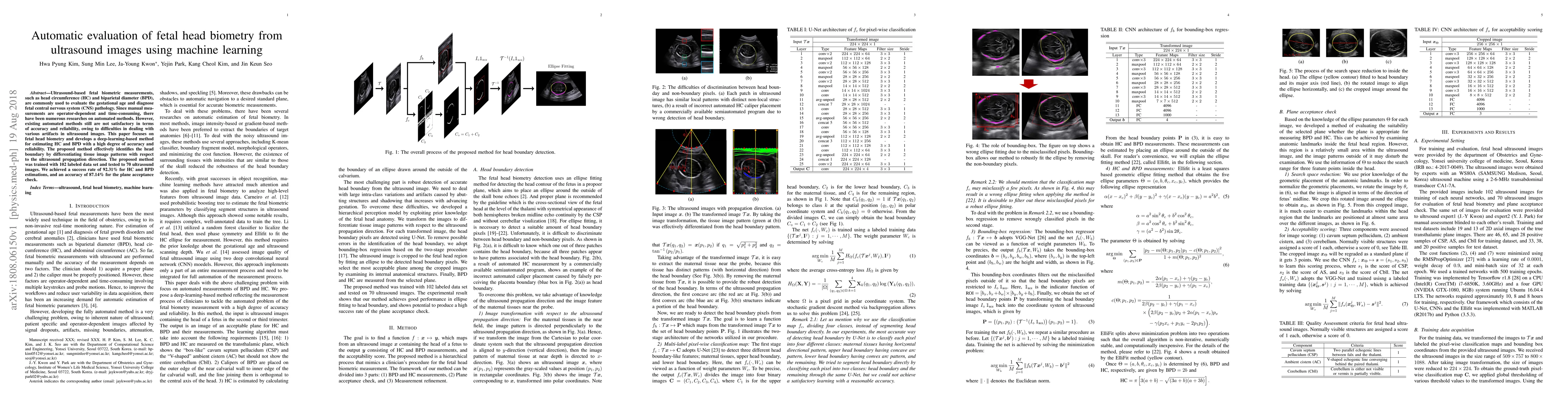 This paper presents a deep-learning-based method for automatic evaluation of fetal head biometry from ultrasound images, achieving high accuracy and reliability in estimating head circumference and biparietal diameter. The method successfully identifies head boundaries and demonstrates a success rate of 92.31% for measurements and 87.14% for plane acceptance.