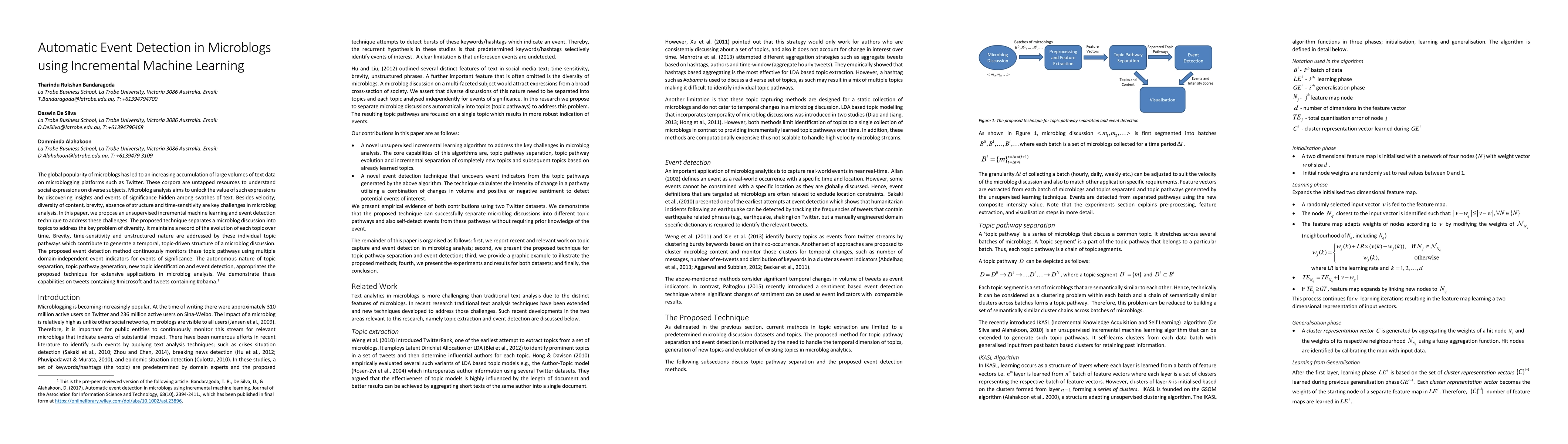The global popularity of microblogs has led to an increasing accumulation of large volumes of text data on microblogging platforms such as Twitter. These corpora are untapped resources to understand social expressions on diverse subjects. Microblog analysis aims to unlock the value of such expressions by discovering insights and events of significance hidden among swathes of text. Besides velocity; diversity of content, brevity, absence of structure and time-sensitivity are key challenges in microblog analysis. In this paper, we propose an unsupervised incremental machine learning and event detection technique to address these challenges. The proposed technique separates a microblog discussion into topics to address the key problem of diversity. It maintains a record of the evolution of each topic over time. Brevity, time-sensitivity and unstructured nature are addressed by these individual topic pathways which contribute to generate a temporal, topic-driven structure of a microblog discussion. The proposed event detection method continuously monitors these topic pathways using multiple domain-independent event indicators for events of significance. The autonomous nature of topic separation, topic pathway generation, new topic identification and event detection, appropriates the proposed technique for extensive applications in microblog analysis. We demonstrate these capabilities on tweets containing #microsoft and tweets containing #obama.