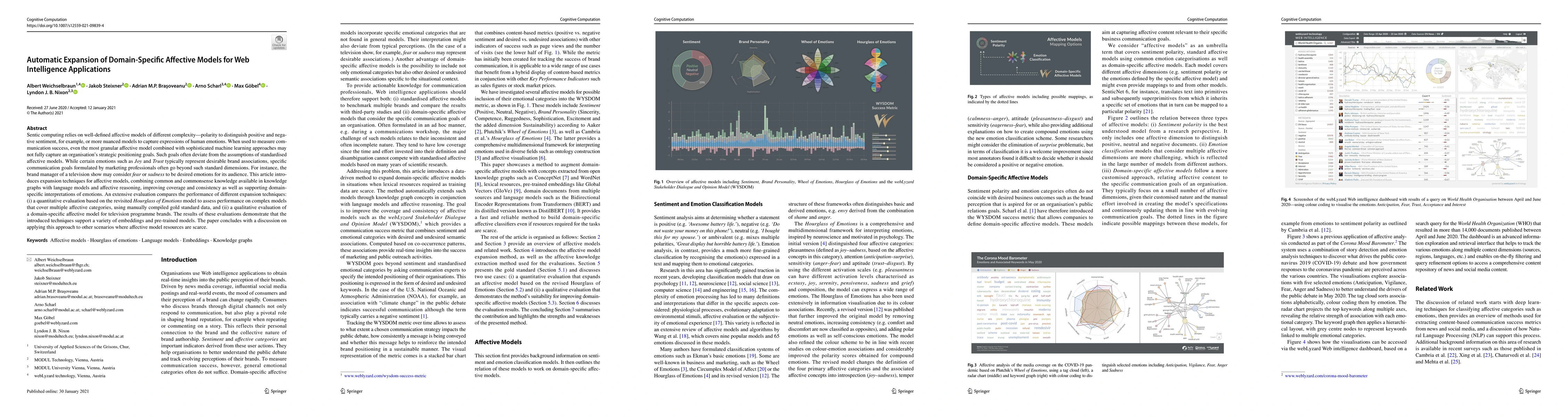 Sentic computing relies on well-defined affective models of different complexity - polarity to distinguish positive and negative sentiment, for example, or more nuanced models to capture expressions of human emotions. When used to measure communication success, even the most granular affective model combined with sophisticated machine learning approaches may not fully capture an organisation's strategic positioning goals. Such goals often deviate from the assumptions of standardised affective models. While certain emotions such as Joy and Trust typically represent desirable brand associations, specific communication goals formulated by marketing professionals often go beyond such standard dimensions. For instance, the brand manager of a television show may consider fear or sadness to be desired emotions for its audience. This article introduces expansion techniques for affective models, combining common and commonsense knowledge available in knowledge graphs with language models and affective reasoning, improving coverage and consistency as well as supporting domain-specific interpretations of emotions. An extensive evaluation compares the performance of different expansion techniques: (i) a quantitative evaluation based on the revisited Hourglass of Emotions model to assess performance on complex models that cover multiple affective categories, using manually compiled gold standard data, and (ii) a qualitative evaluation of a domain-specific affective model for television programme brands. The results of these evaluations demonstrate that the introduced techniques support a variety of embeddings and pre-trained models. The paper concludes with a discussion on applying this approach to other scenarios where affective model resources are scarce.